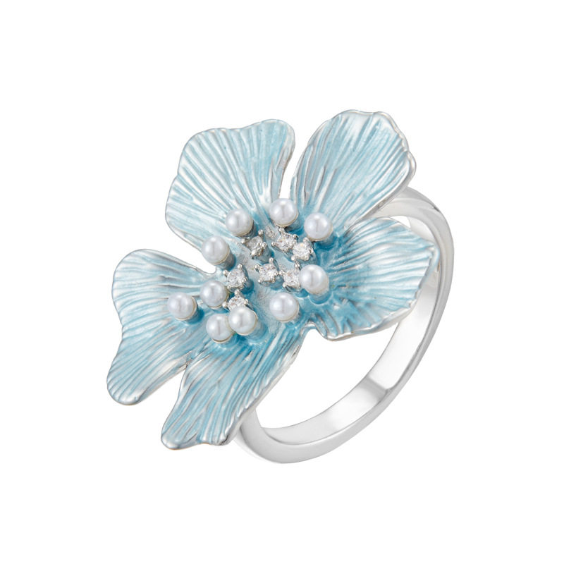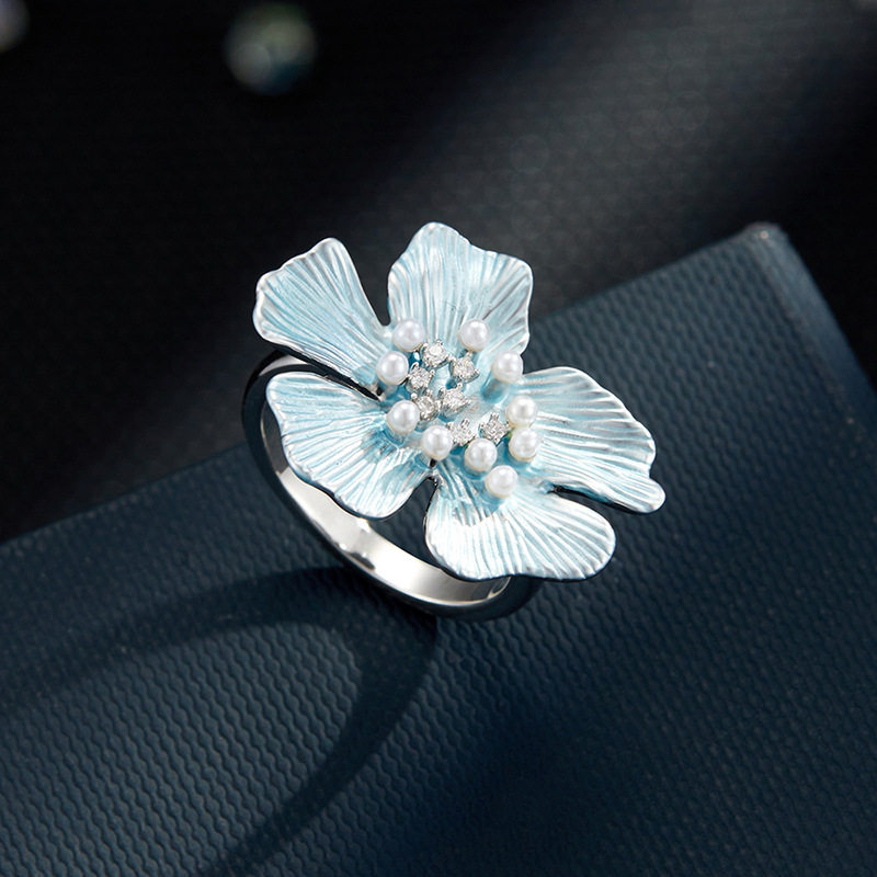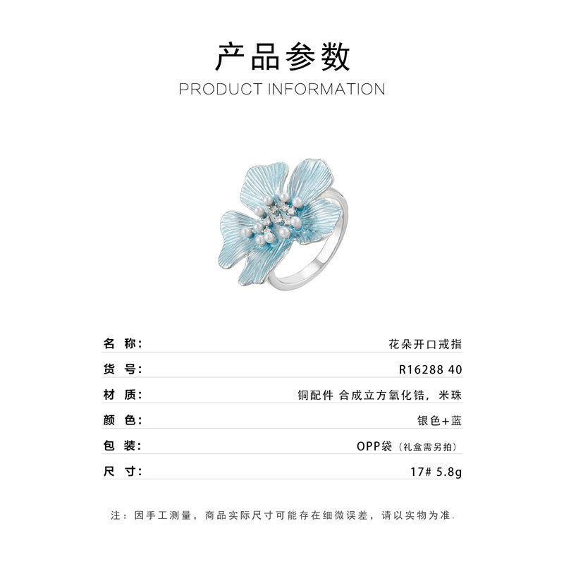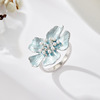 春夏漂亮蓝色拉丝花朵开口戒指时尚百搭可调节食指戒新款