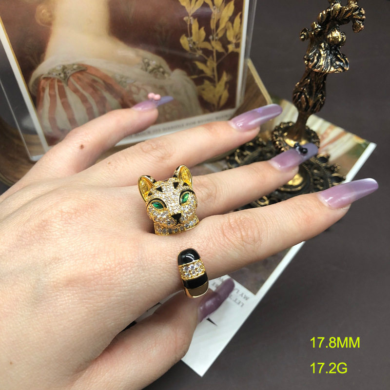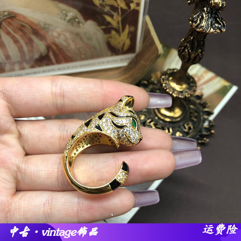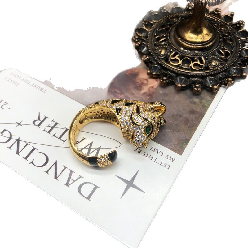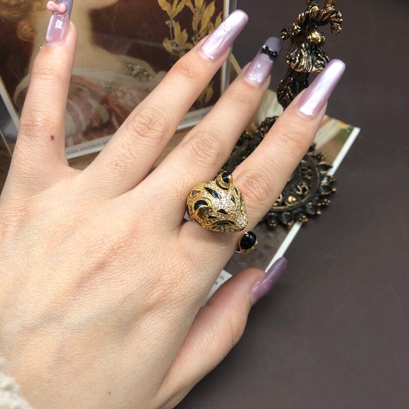 铜材质镀真金锆石镶嵌戒指黑色珐琅釉立体豹子设计时尚精致指环