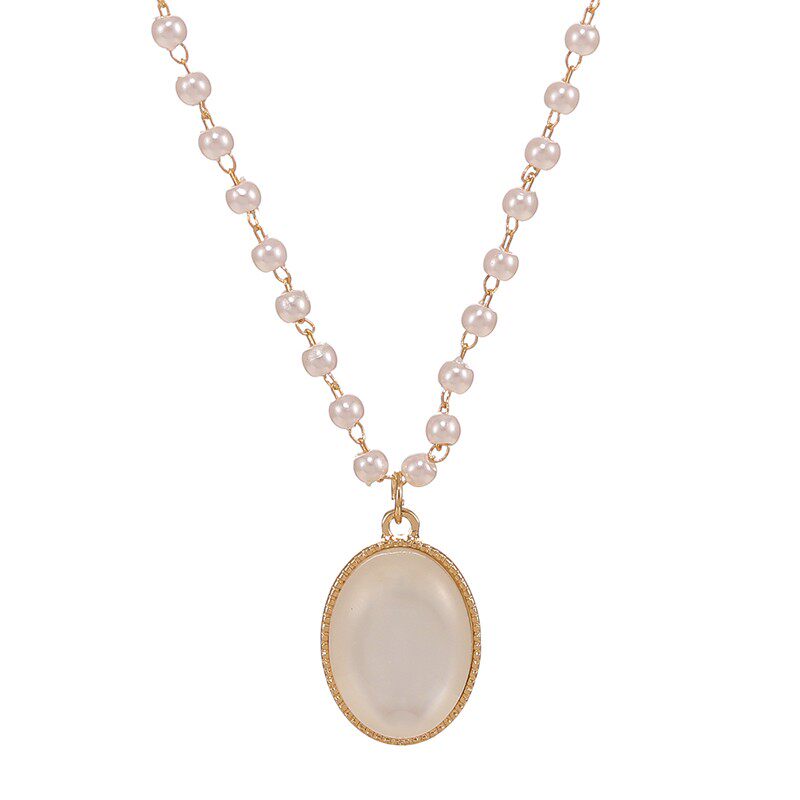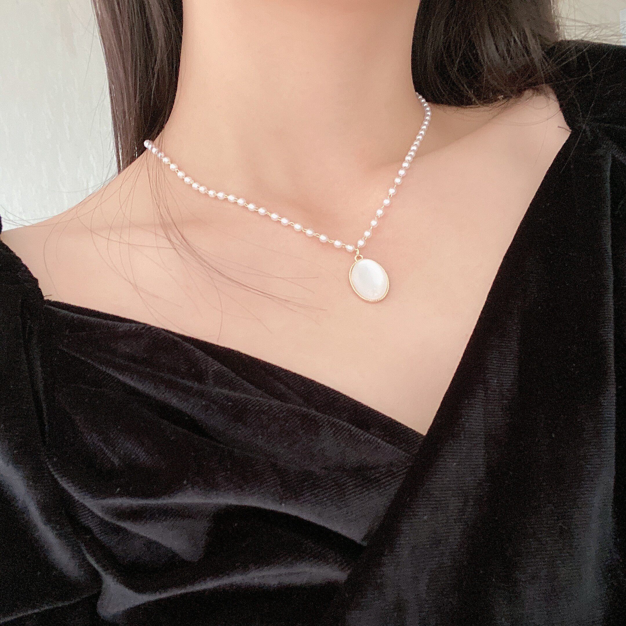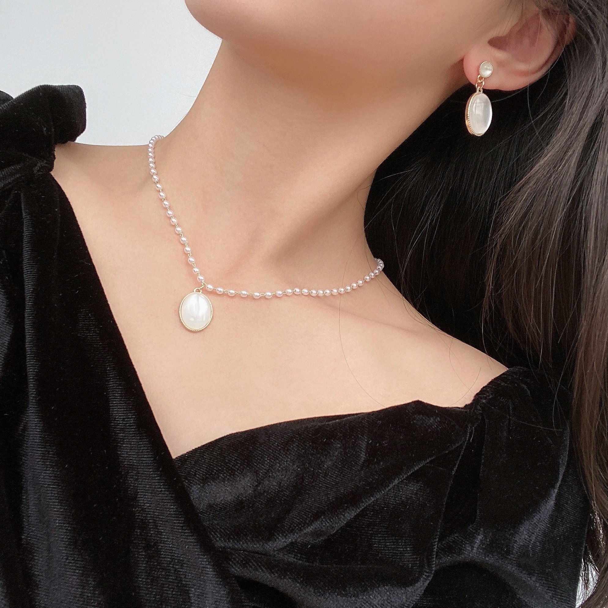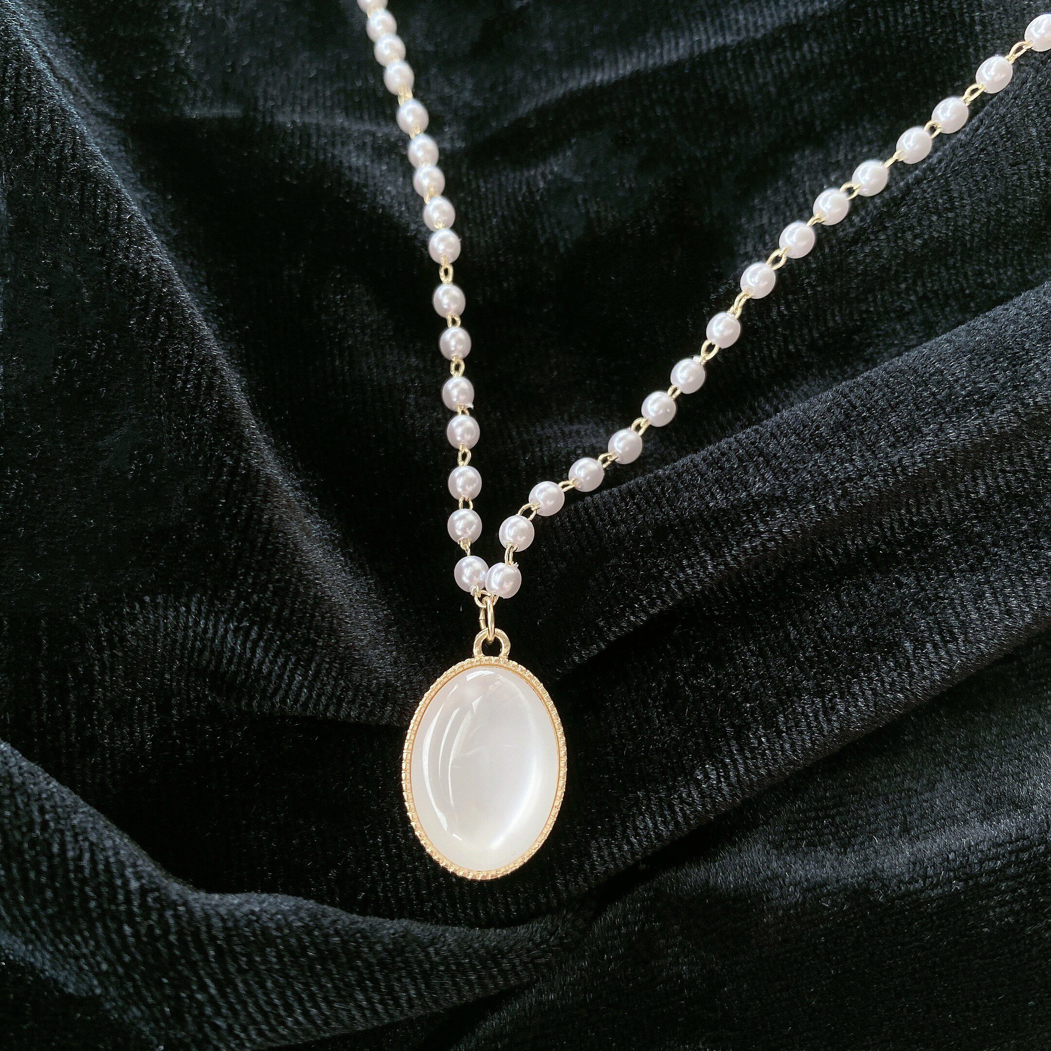 原创复古椭圆猫眼古典白月光珍珠链项链女冷淡风气质简约锁骨链