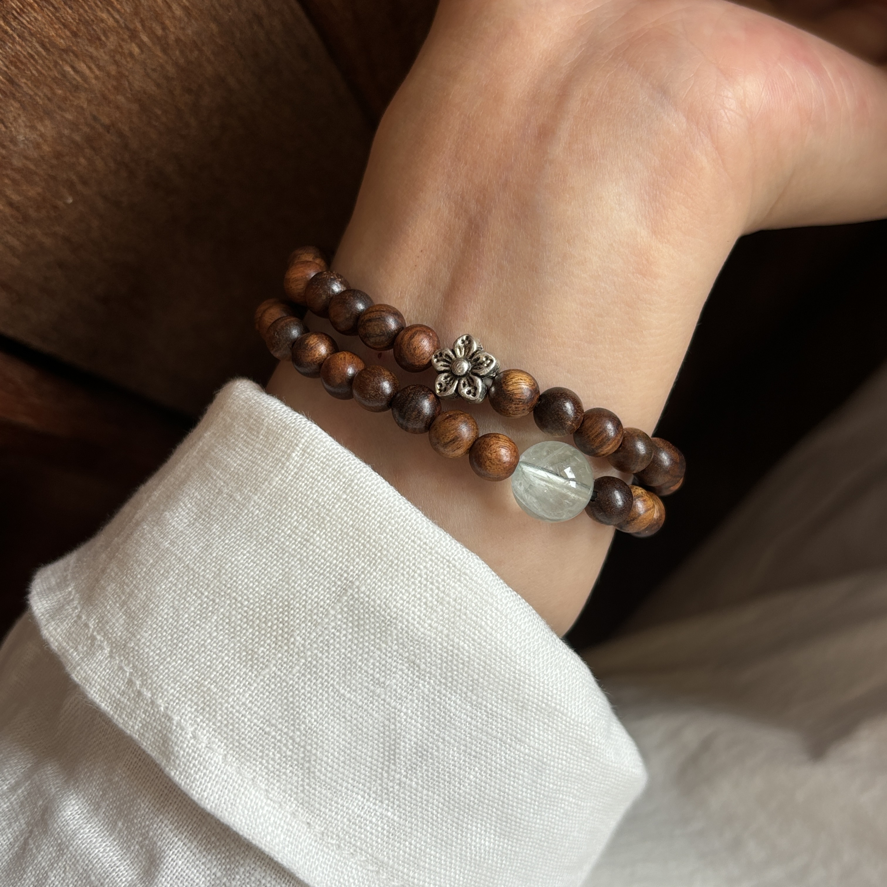 原创自制新中式国风古物配色天然紫兔毛绿兔毛白水晶黑花梨手链