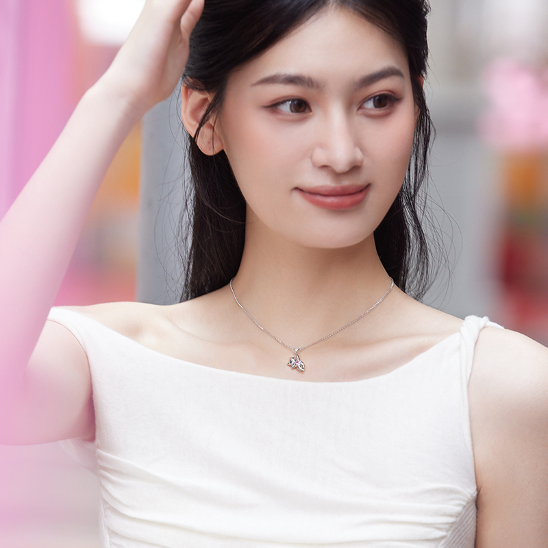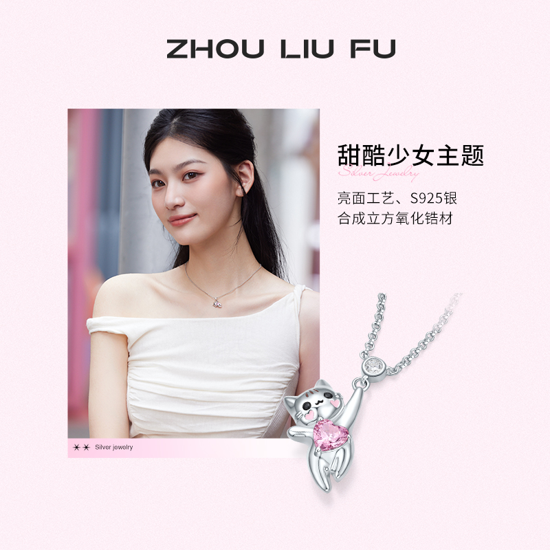 周六福饰品项链女粉心小喵链坠S925银高级感轻奢小众送女友礼物