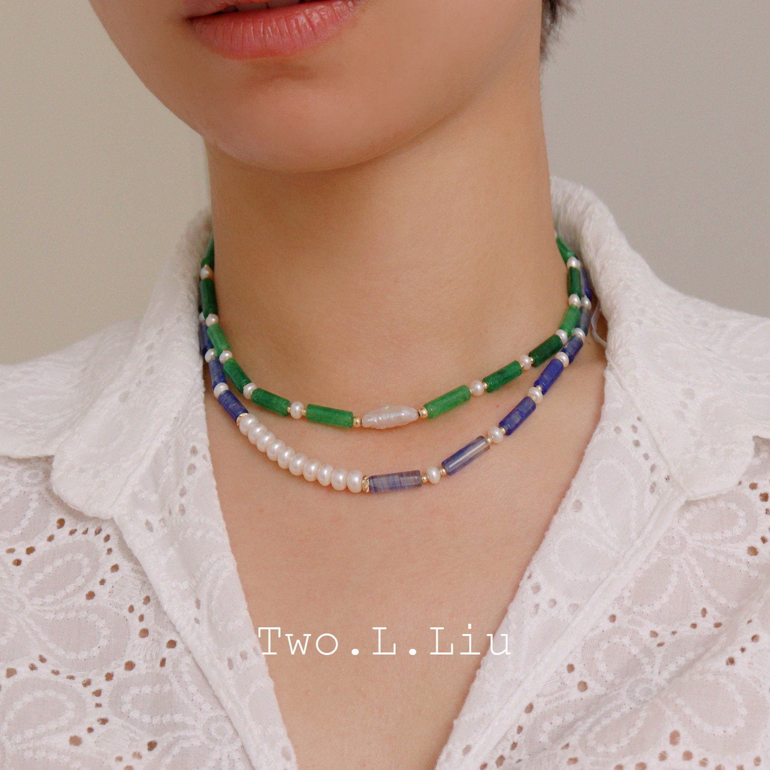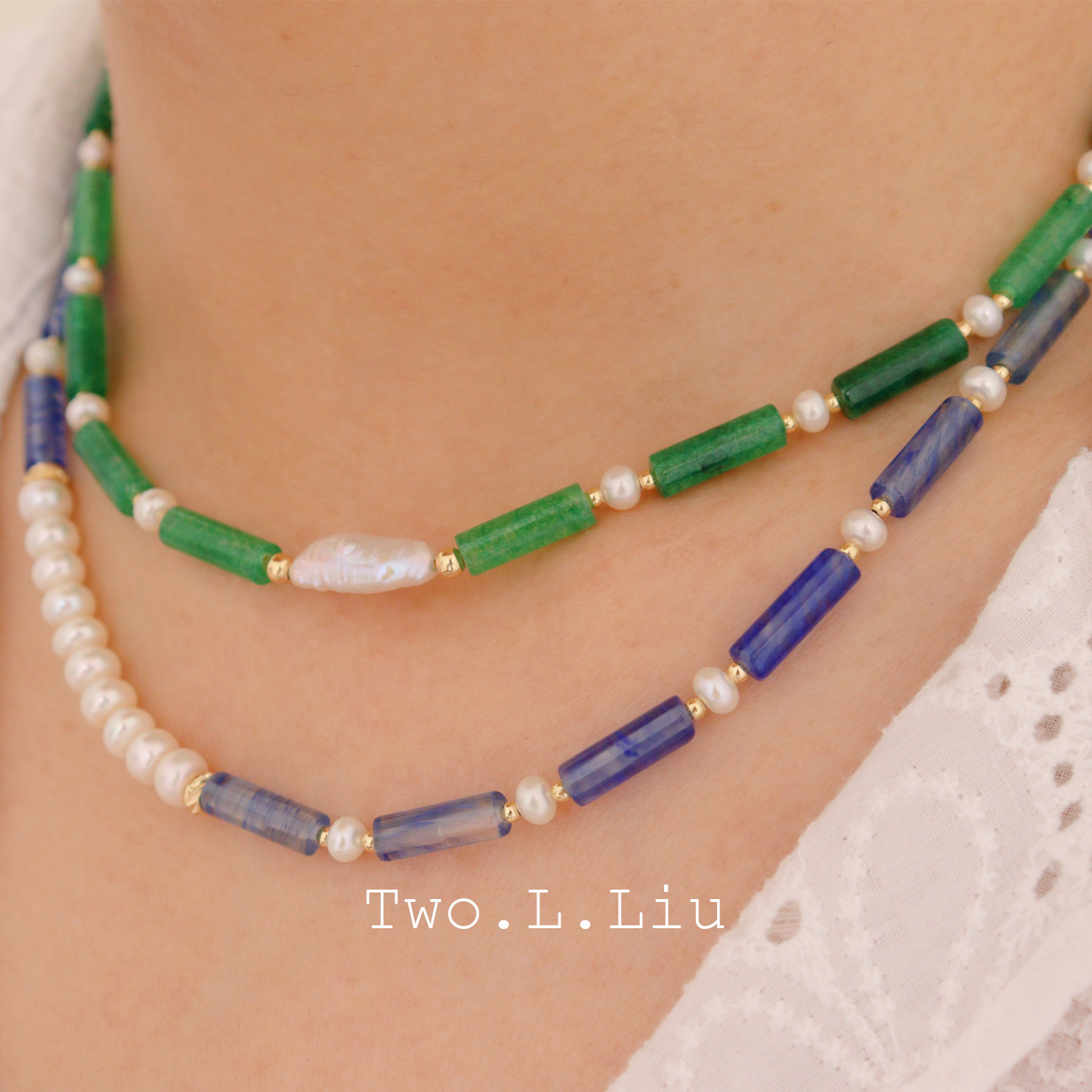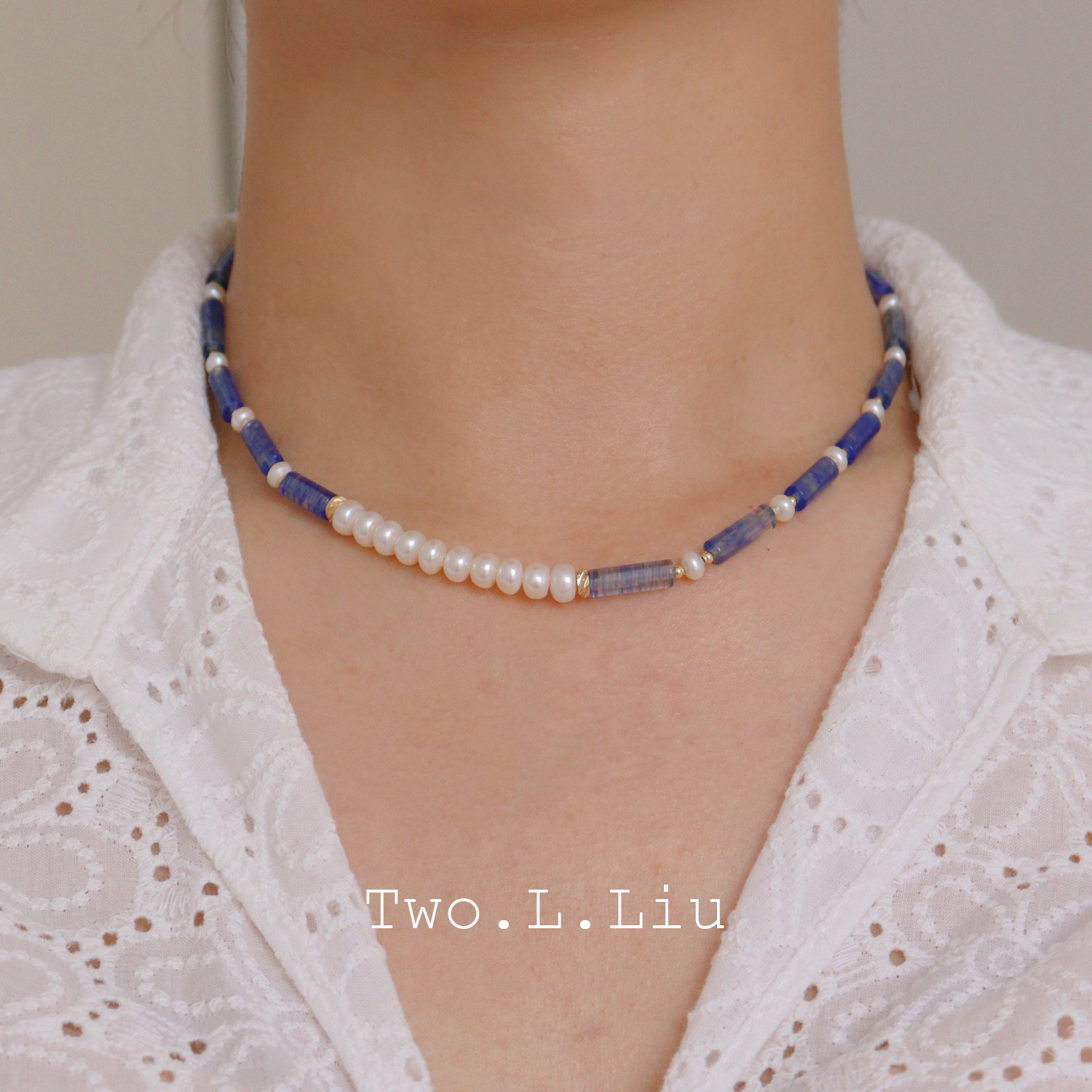 twolliu studio复古新中式蓝色天然石项链女玉色珍珠个性潮锁骨链