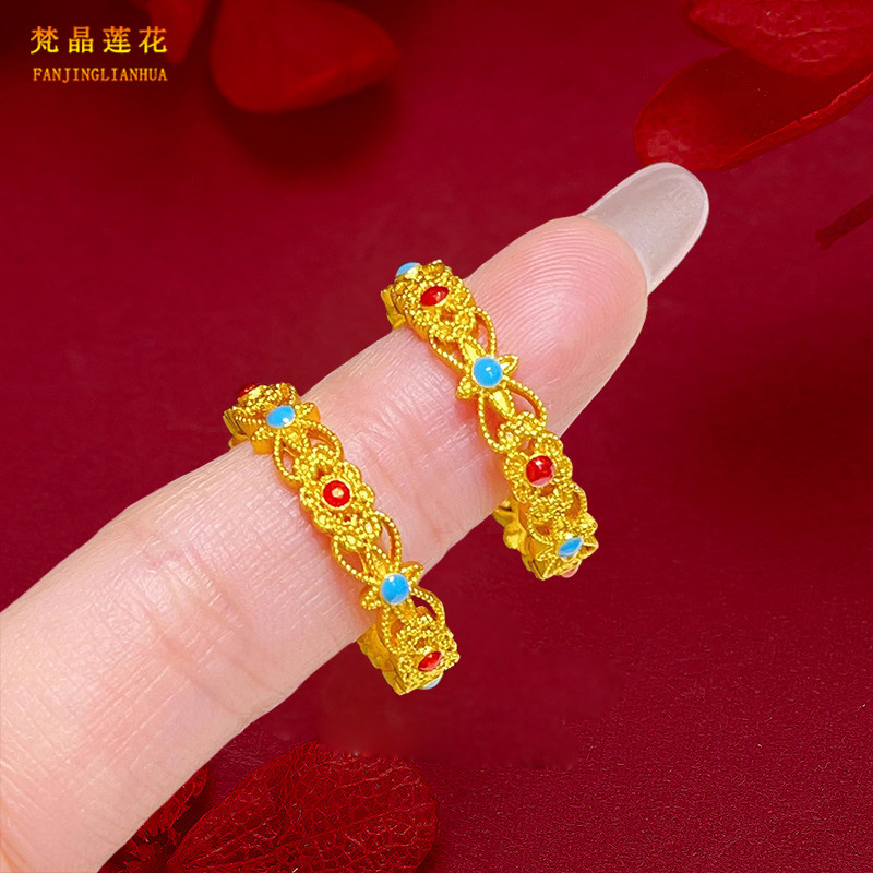 金店同款沙金珐琅彩镂空花丝戒指女时尚闭口如意素圈指环仿真黄金