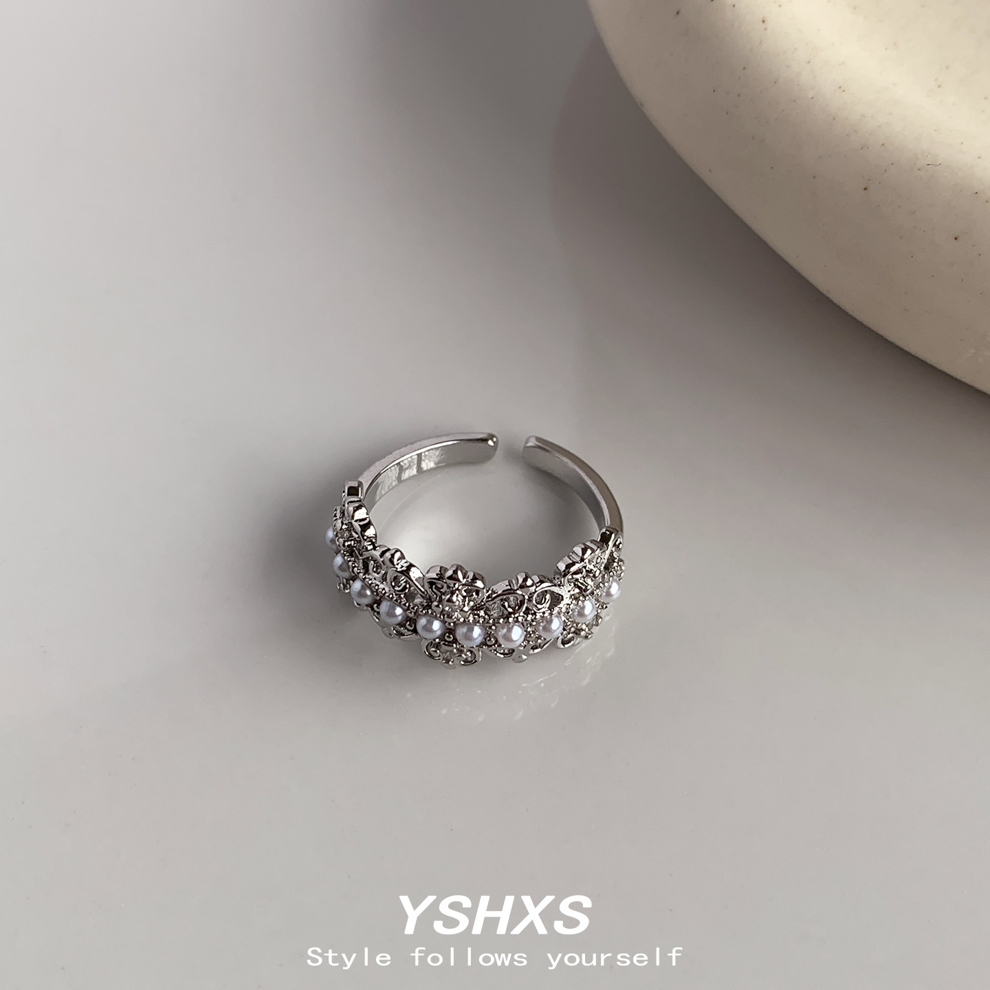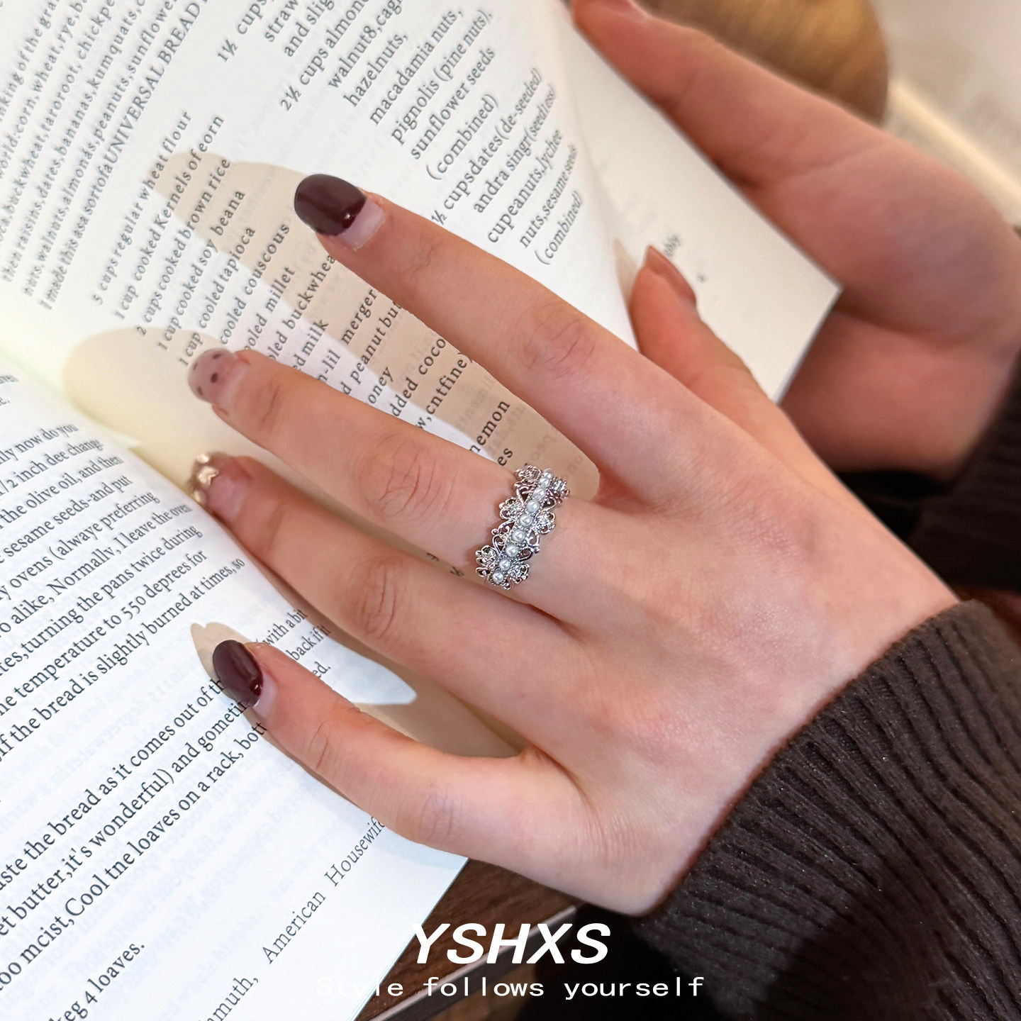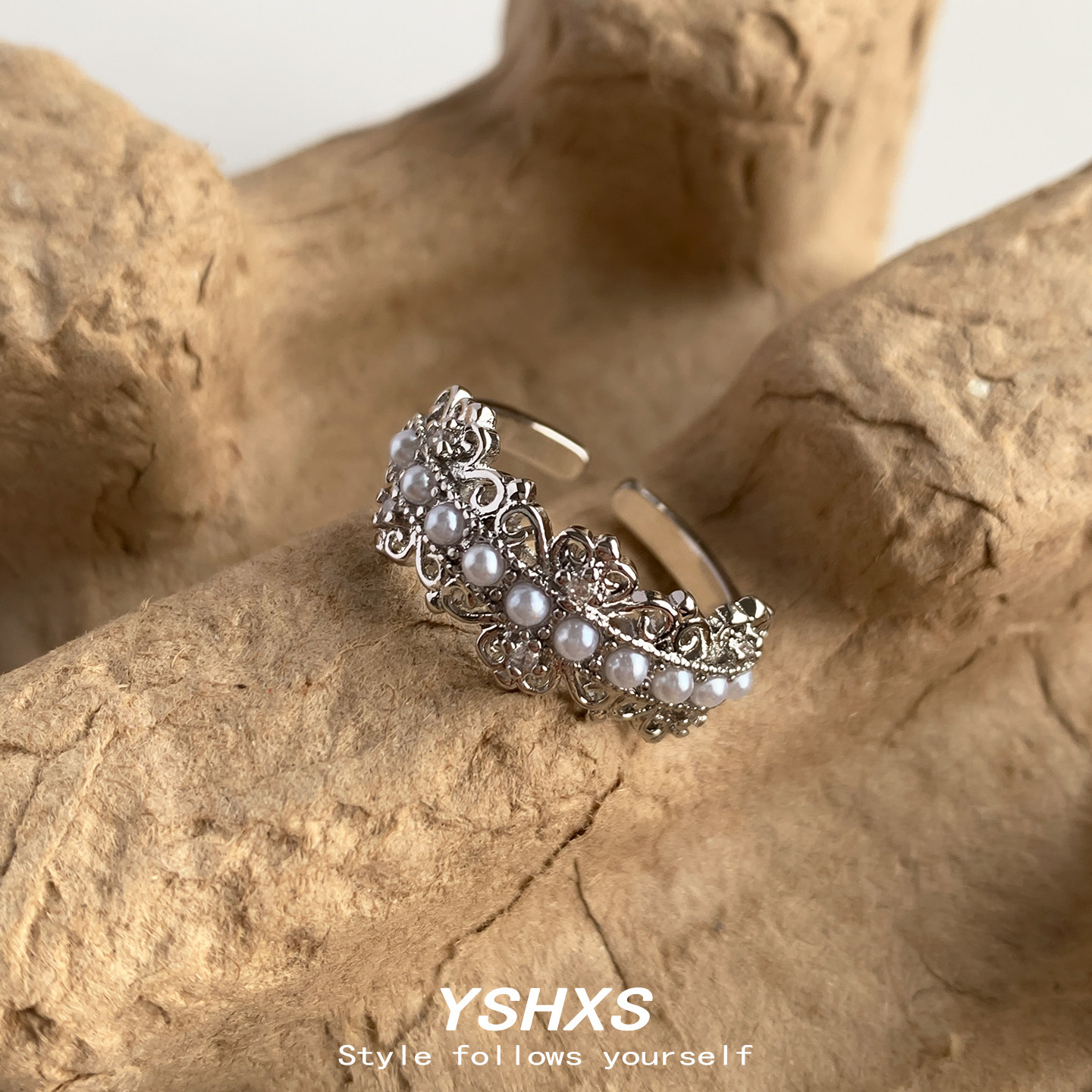 设计师款珍珠皇冠戒指女小众高级感蕾丝百搭开口指环