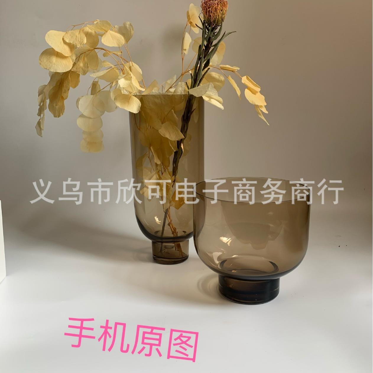 灰色简约现代圆形玻璃花器客厅花艺插花装饰花瓶摆件样板间软装