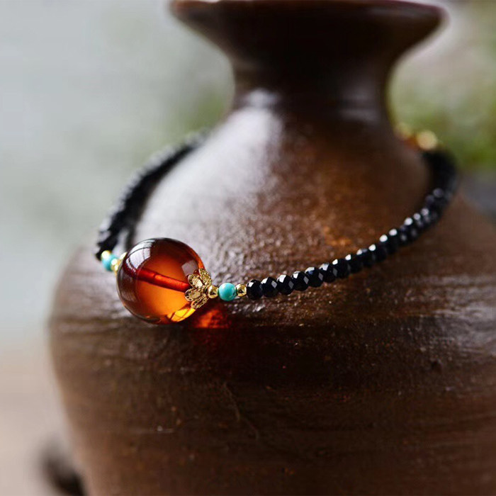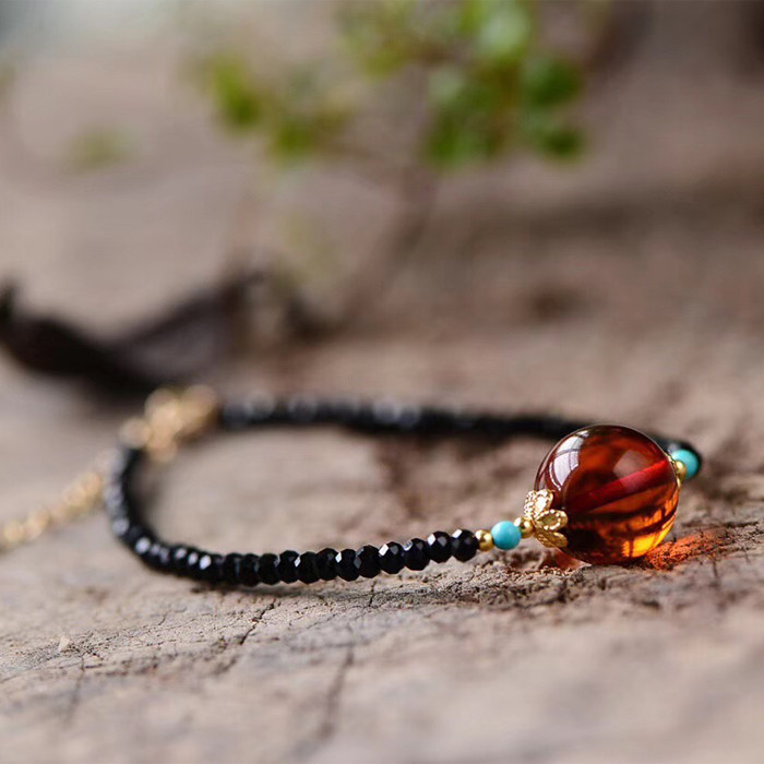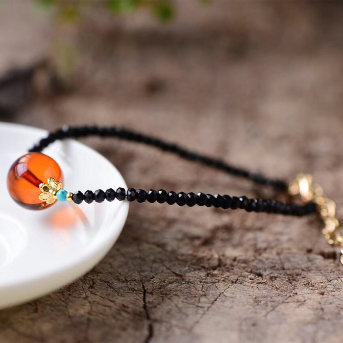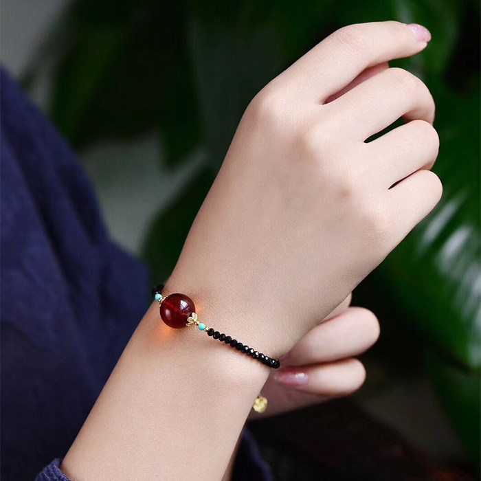 天然黑色尖晶石手链 天然血珀转运珠手链 925银延长链 男女