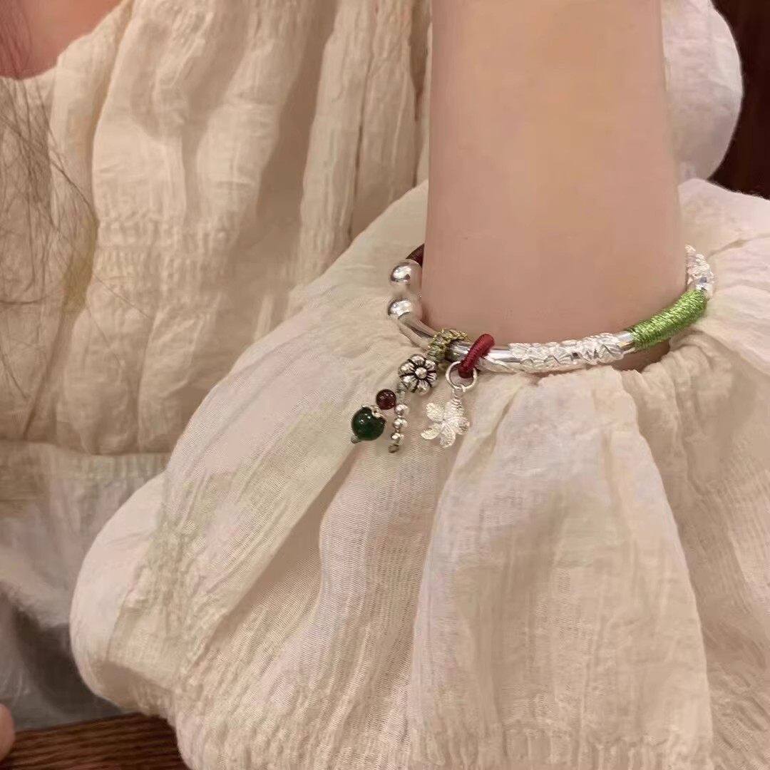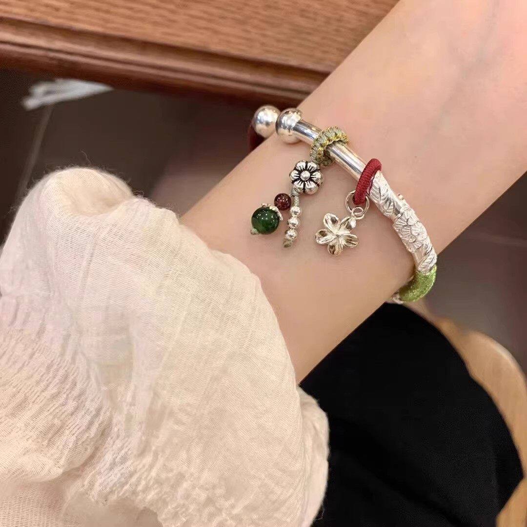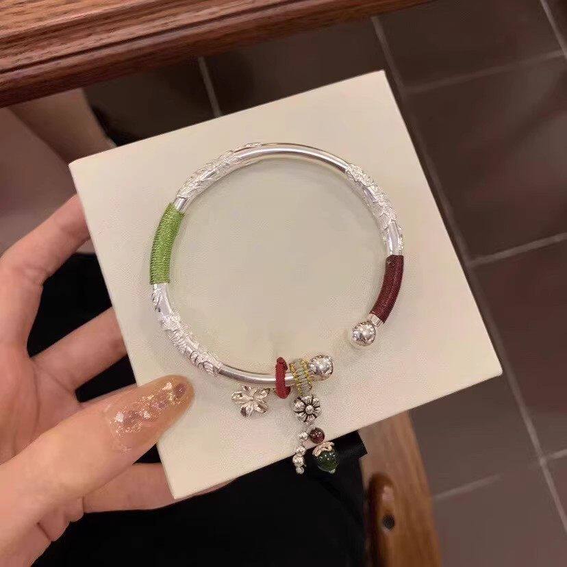 幂琳2026新款开口纯银手镯女s999足银镯子实心南瓜竹节花丝铃铛