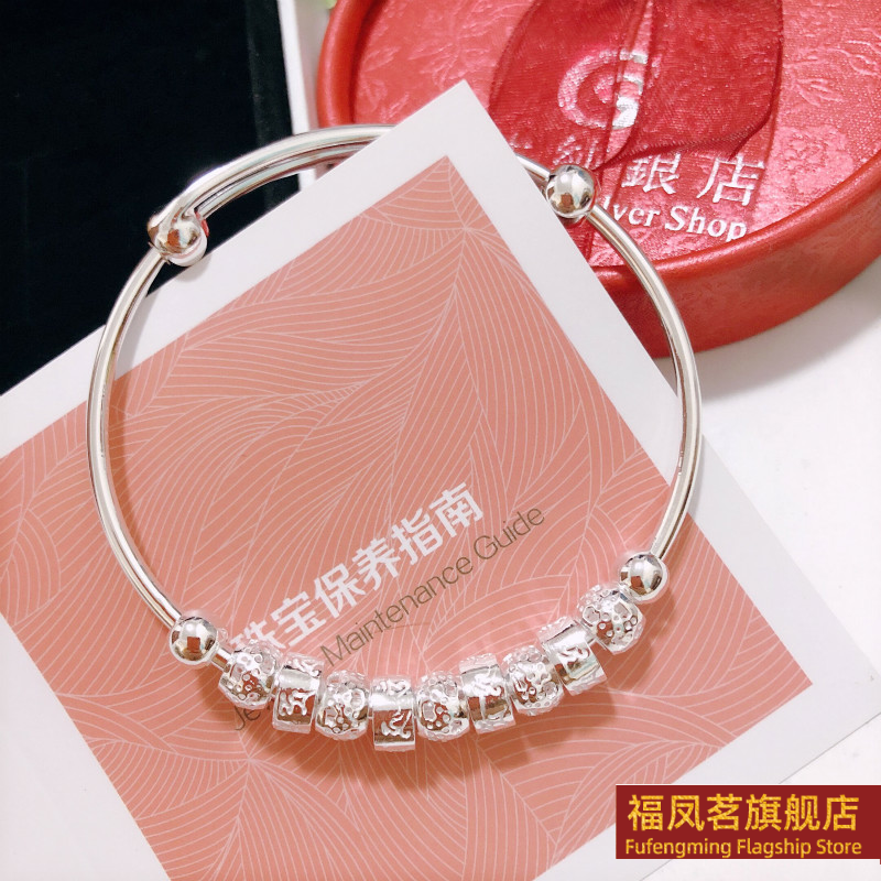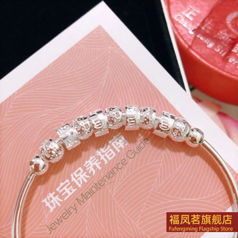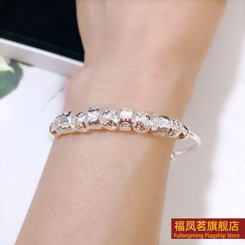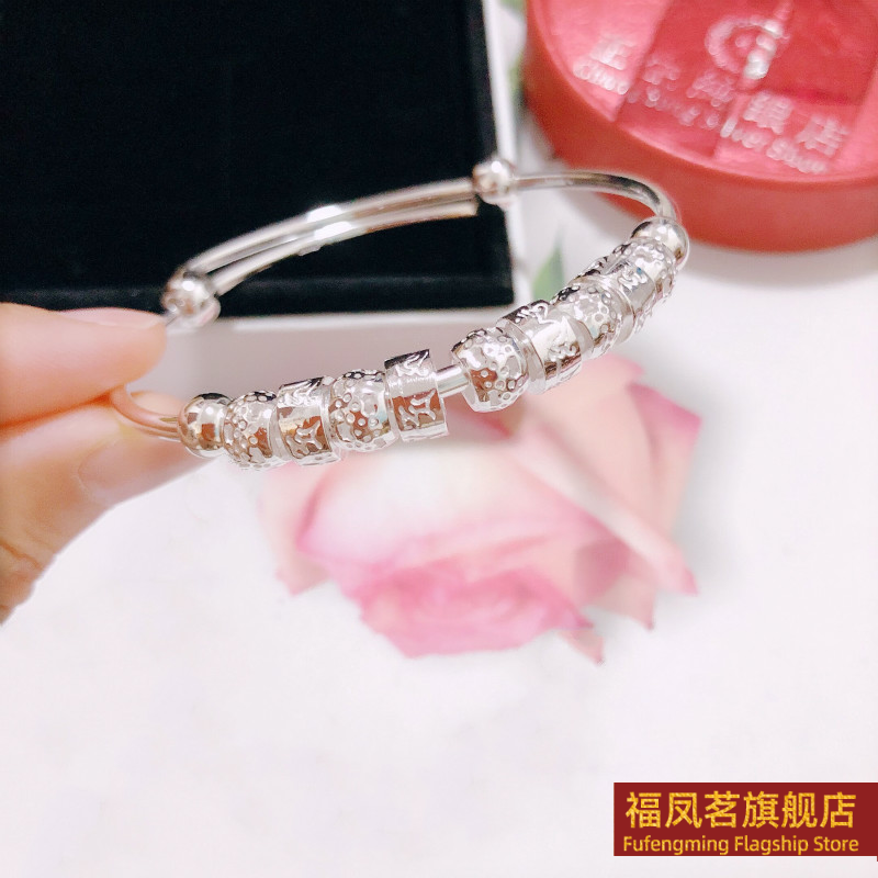 正生新款纯银梵文六字真言转动珠推拉手镯足银999送女友生日礼物