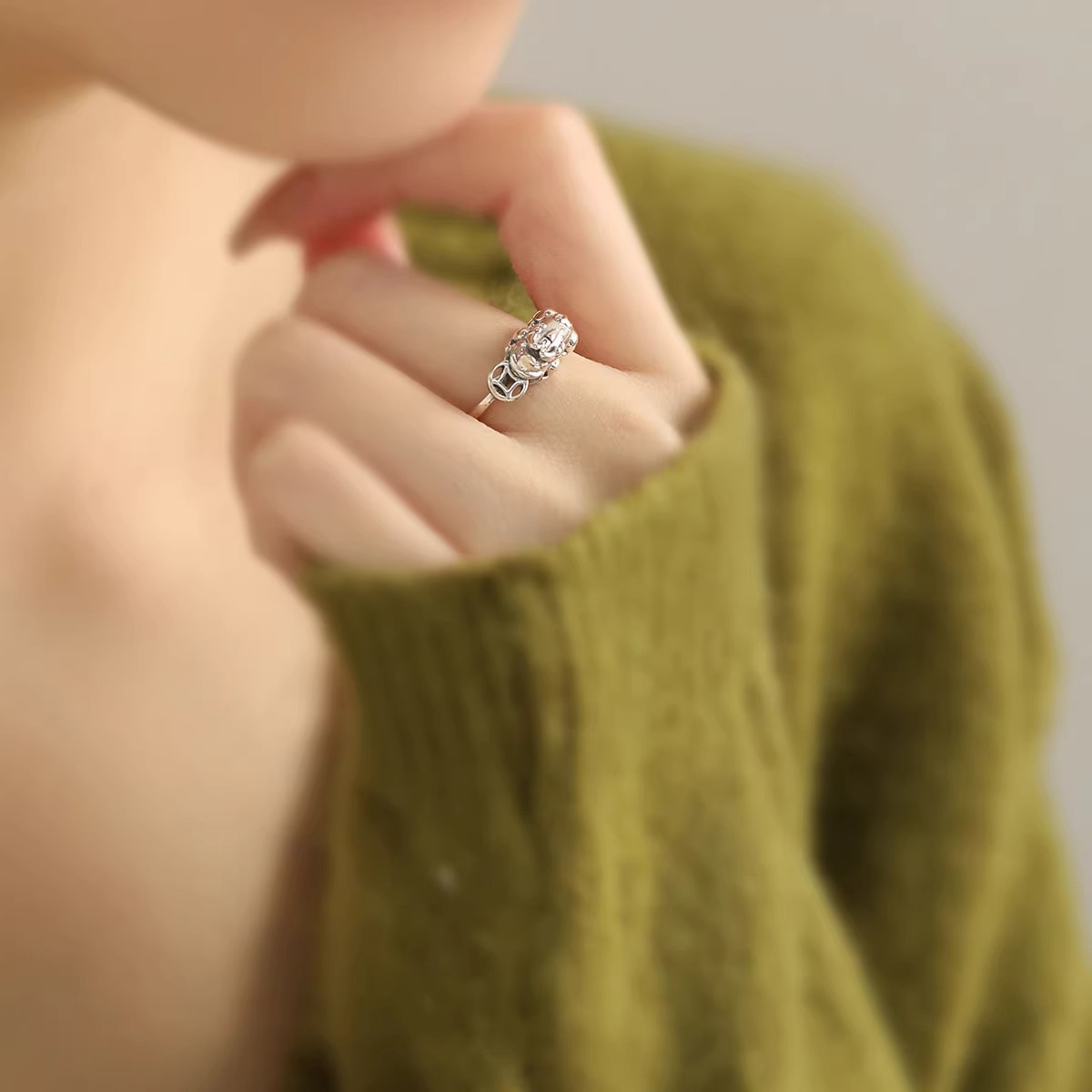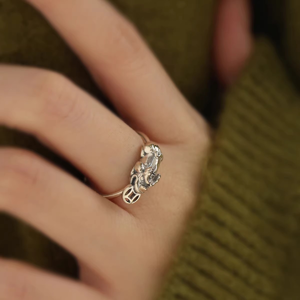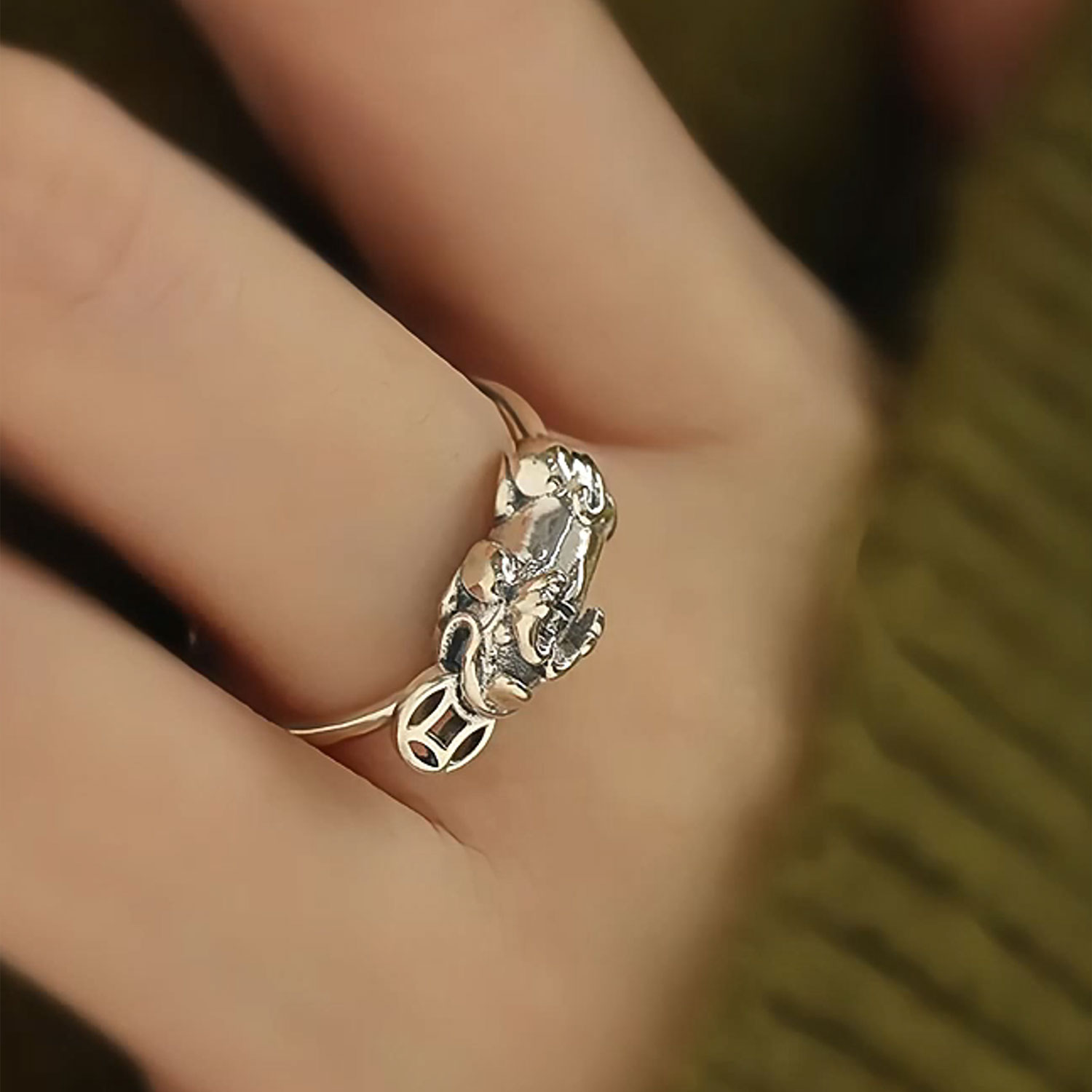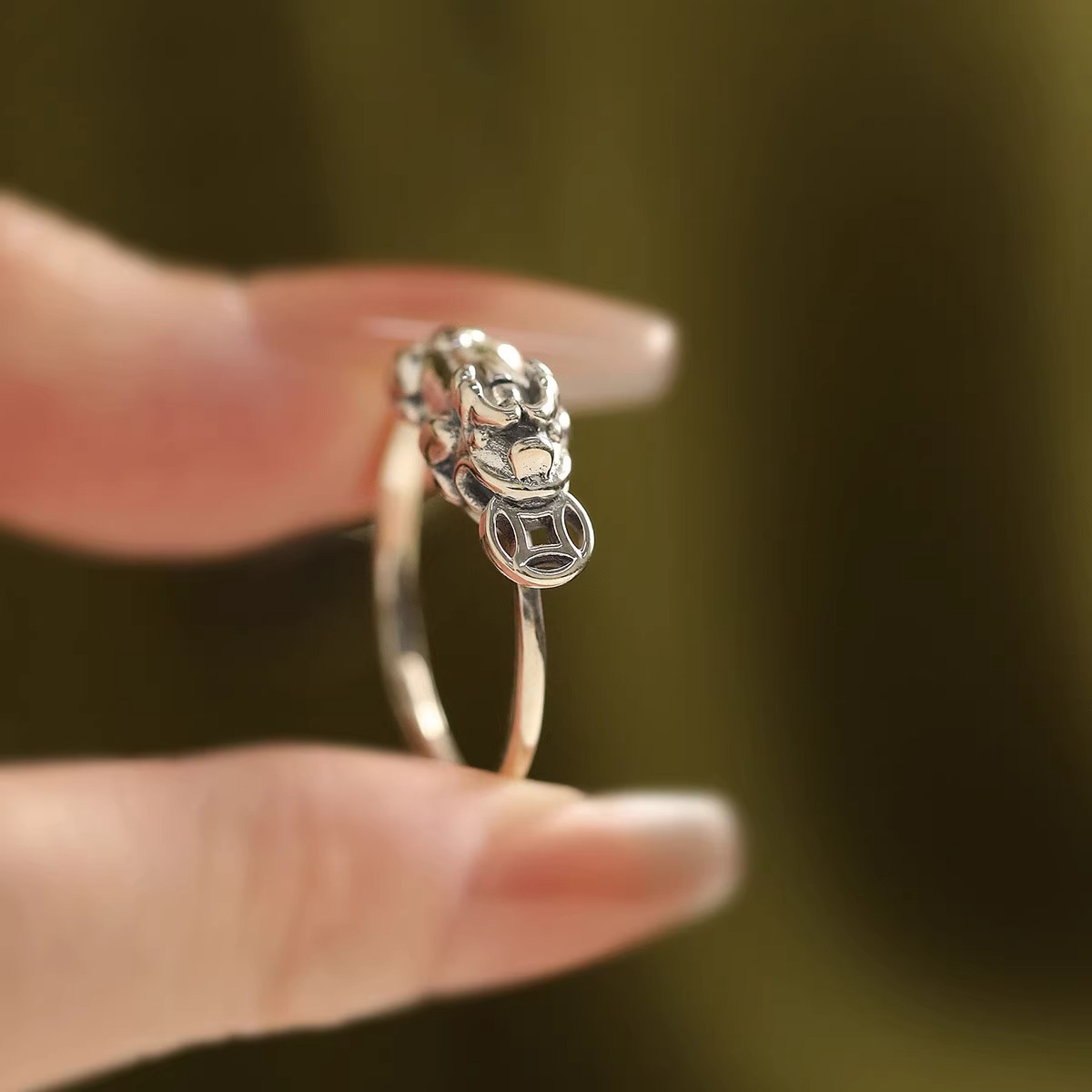 925银铜钱貔貅戒指女新中式小众民族风招财个性开口可调节食指戒