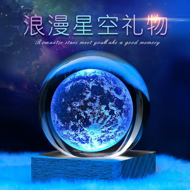 3D立体梦幻银河系水晶球蓝色发光夜灯月球太阳系玻璃球摆件毕业季