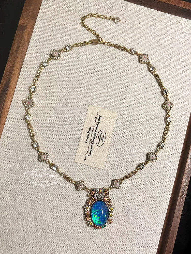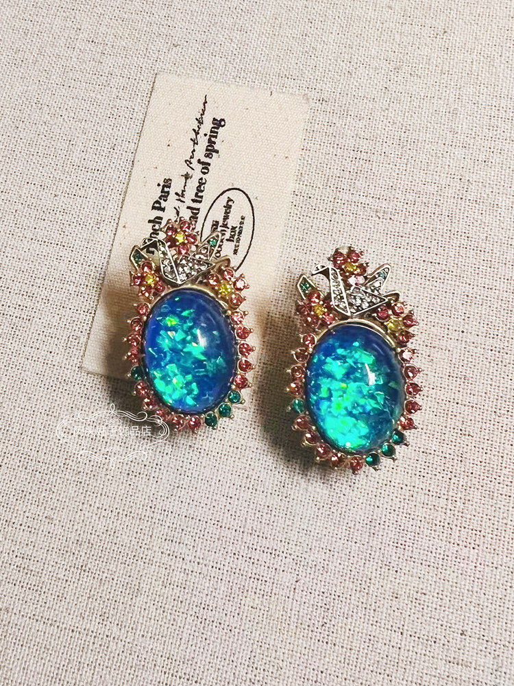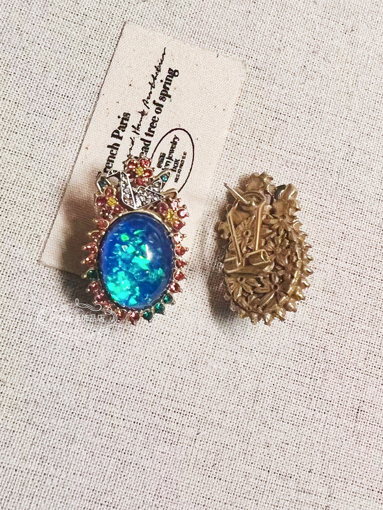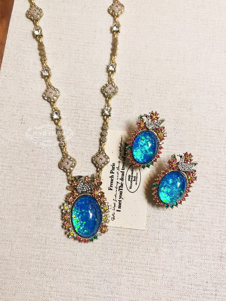 欧美宫廷中古vintage复古气质做旧蓝色欧泊千纸鹤闪钻项链耳环女