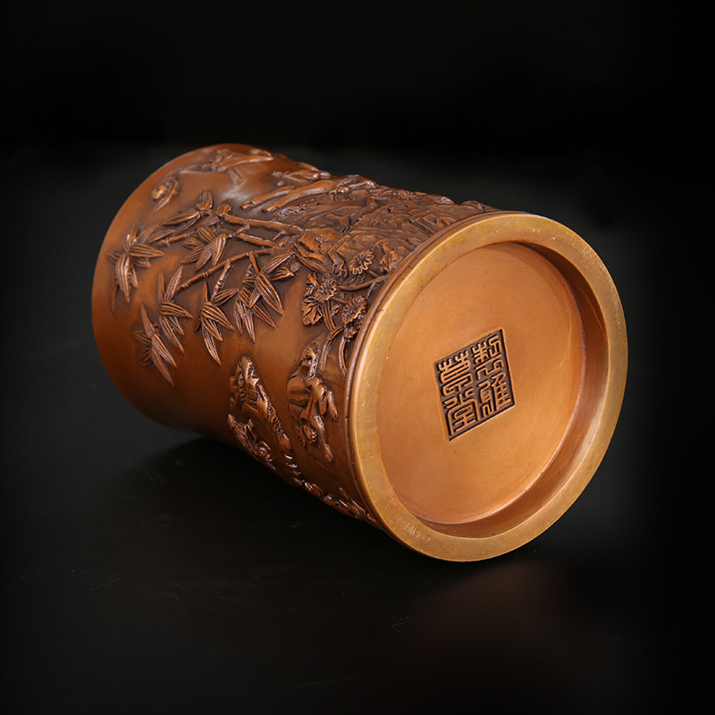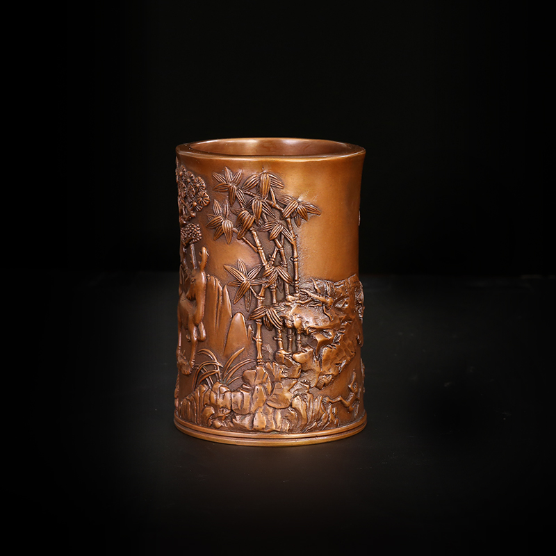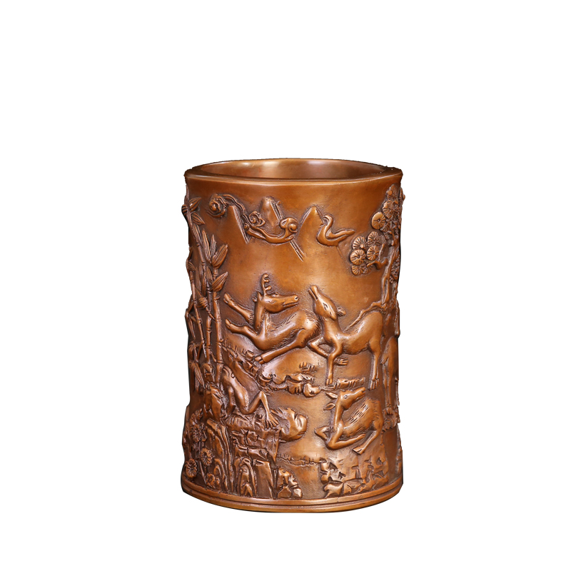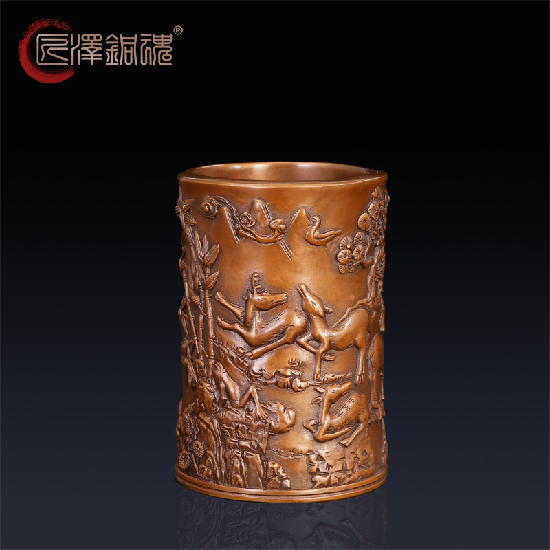 匠泽铜魂 松鹿草笔筒紫铜 纯铜笔筒文房办公用品商务书房装饰摆件