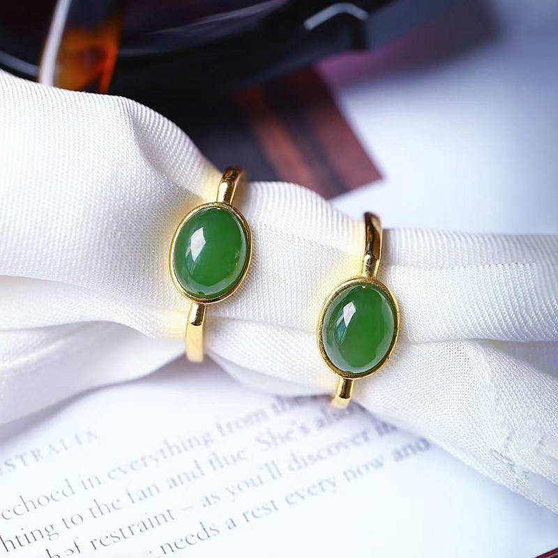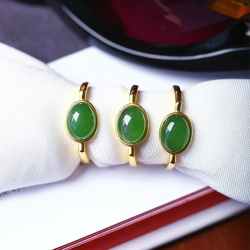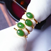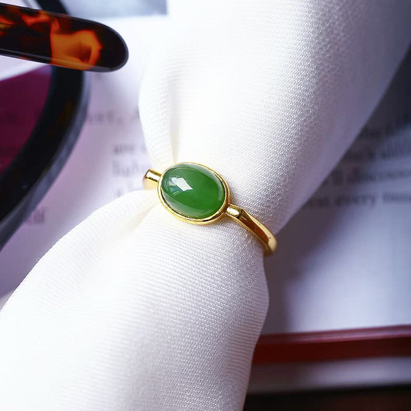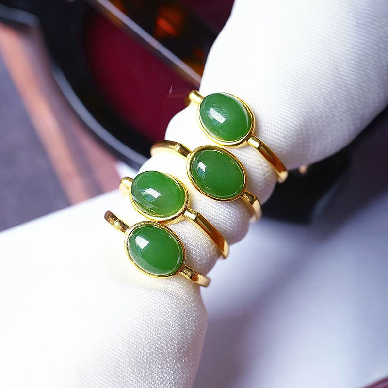 天然俄罗斯碧玉冰绿蛋面纯银镶嵌戒指 女款玉石镶嵌款饰品礼物