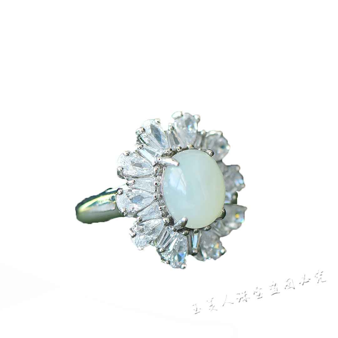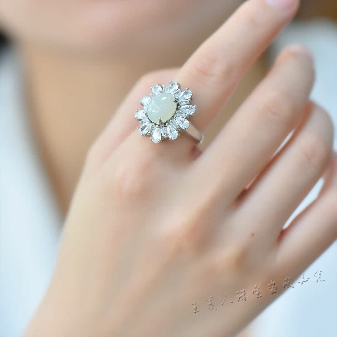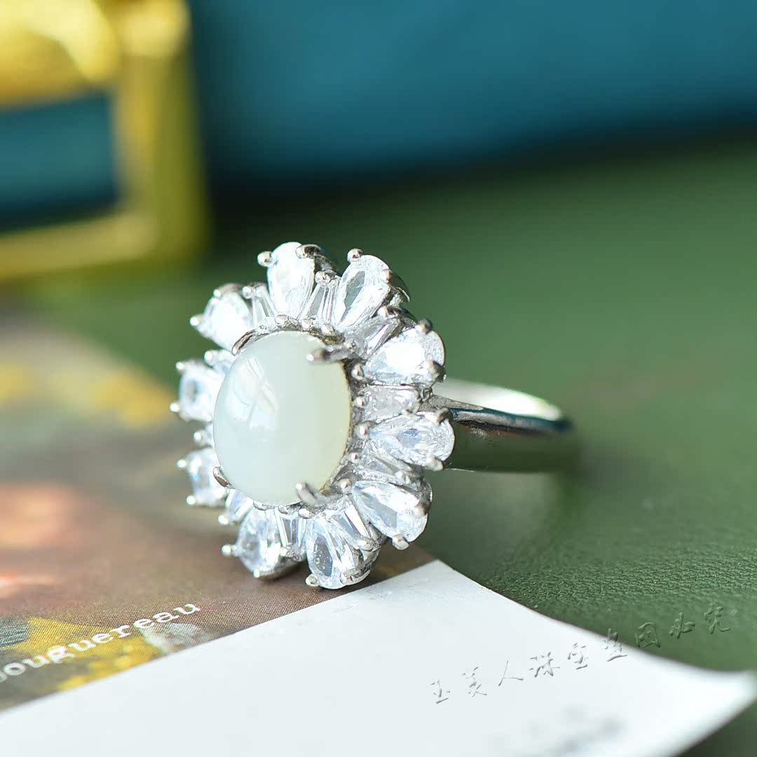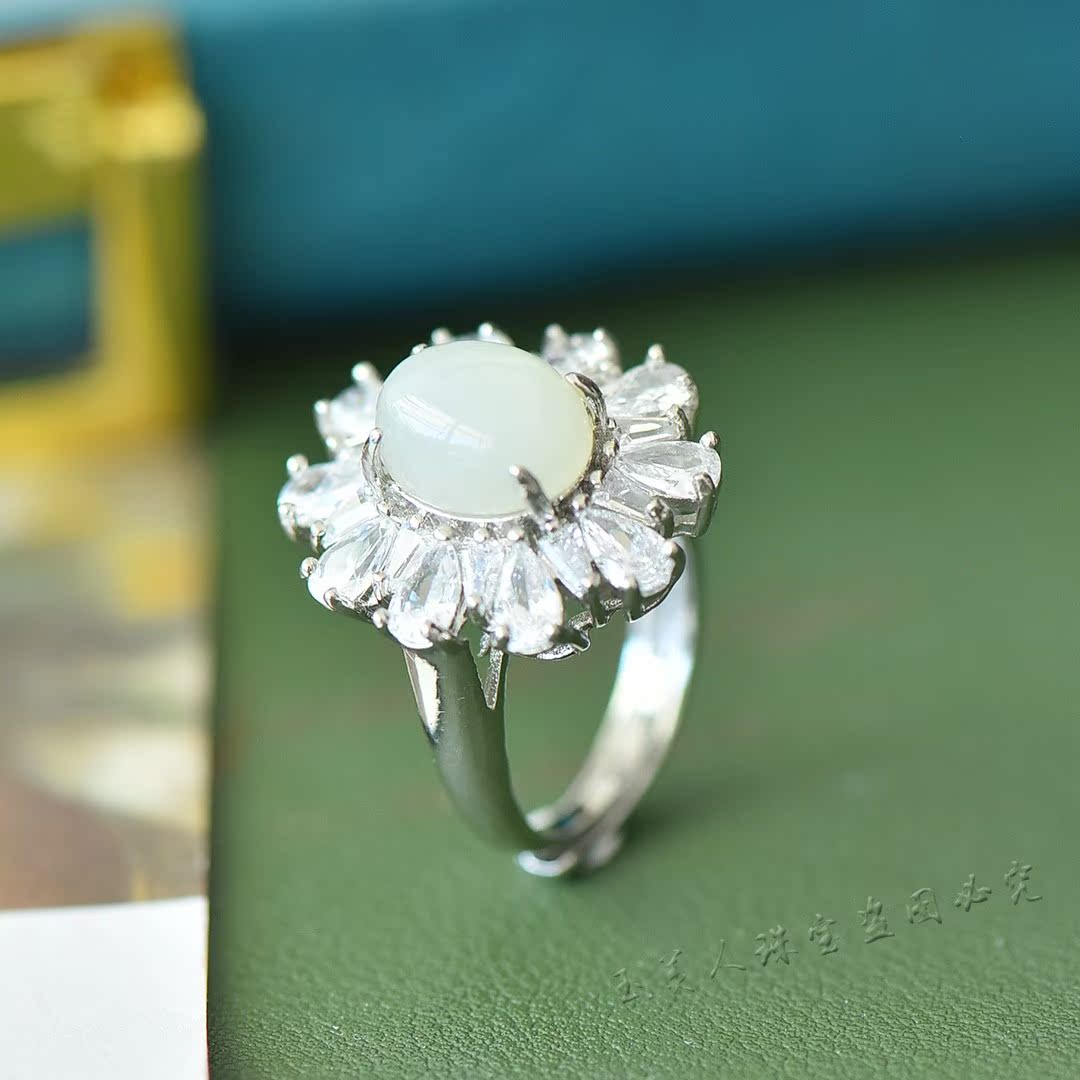 天然和田玉白玉太阳花满钻戒指女款个性时尚豪镶指环可调节戒子