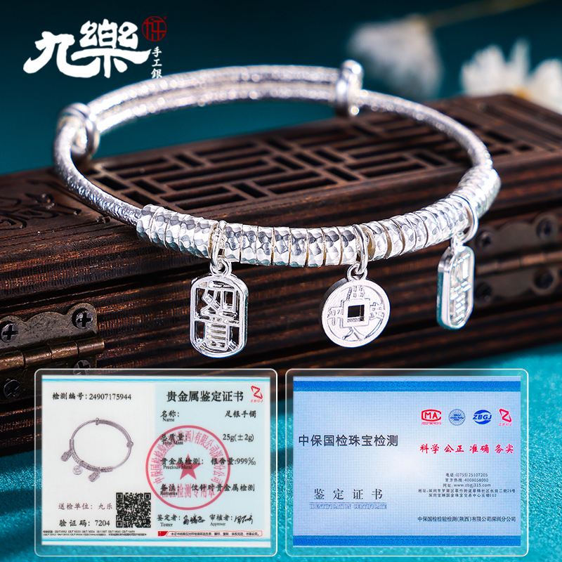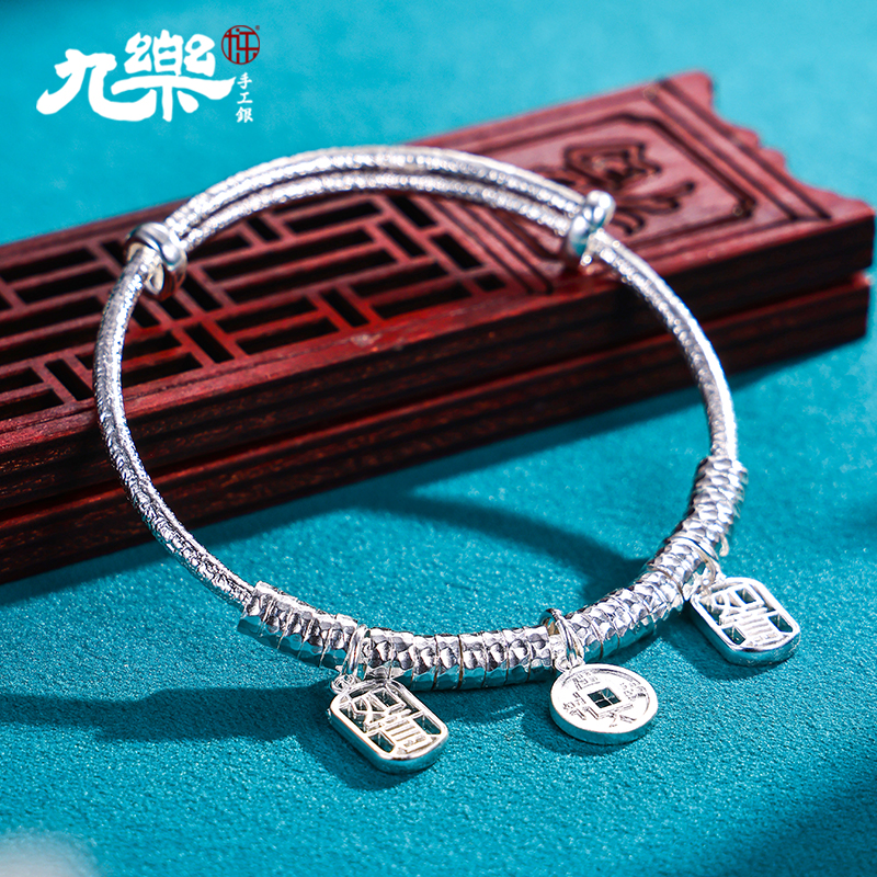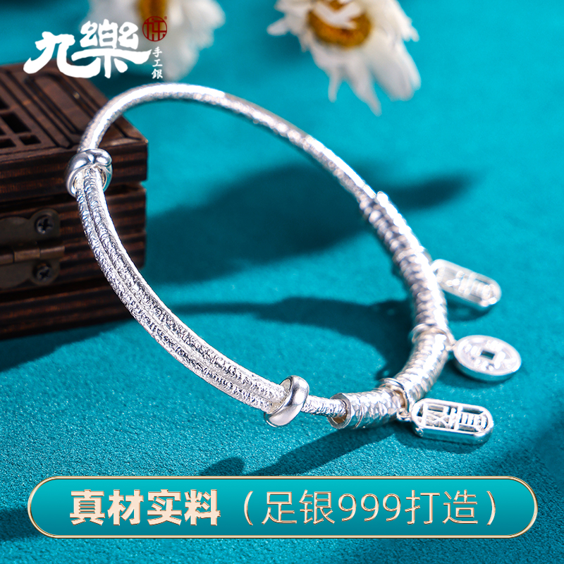 九乐足银999银手镯女纯银出入平安如意推拉手镯万贯盘缠镯子送礼