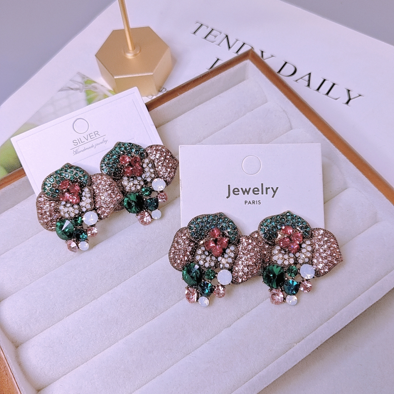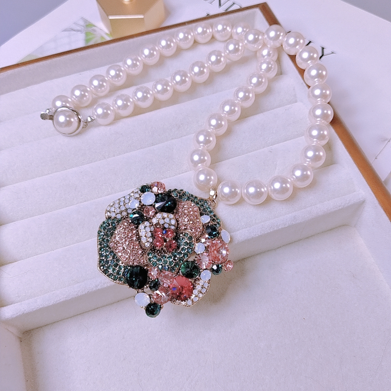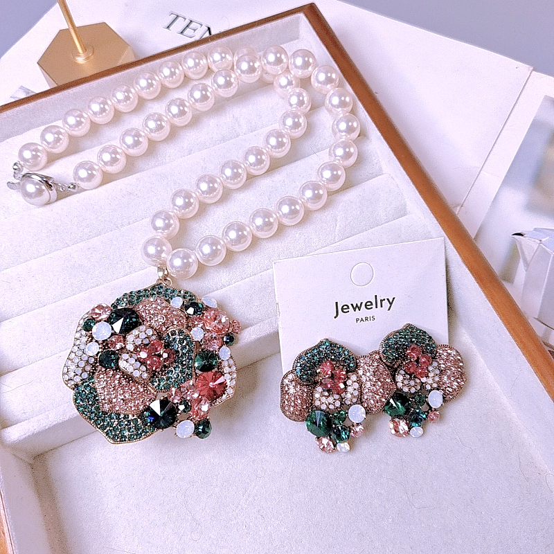 韩国东大门玫瑰水钻锆石珍珠项链毛衣链同款气质耳环时尚套件礼物