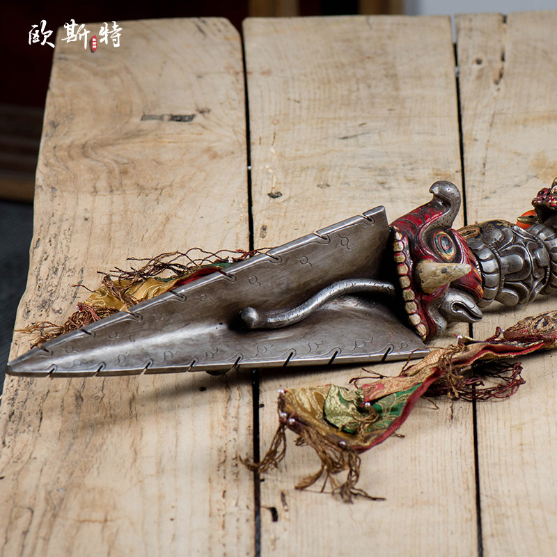 尼泊尔铁做旧飘带五股金刚杵家用供具供具带底座普巴金刚橛高60cm