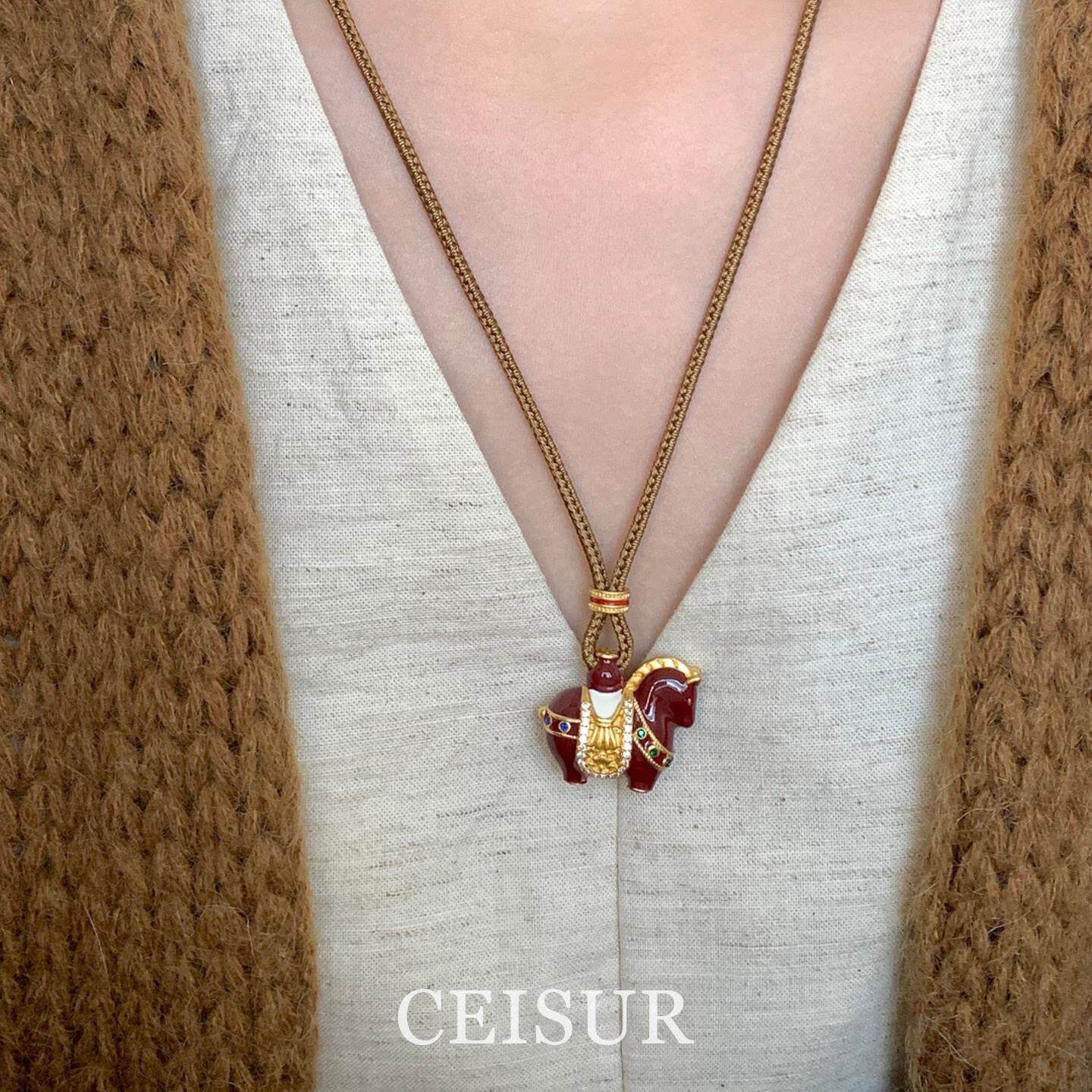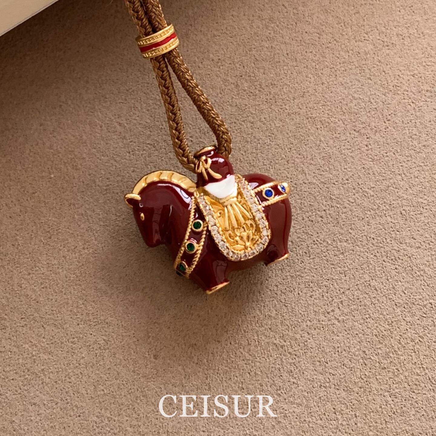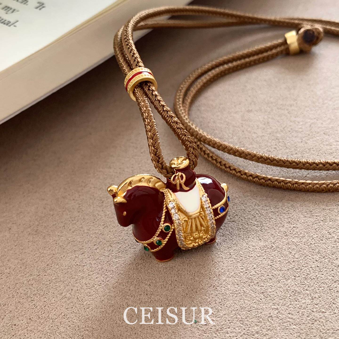 S925纯银新中式红色滴釉小马编绳项链女2026马年轻奢高级感毛衣链