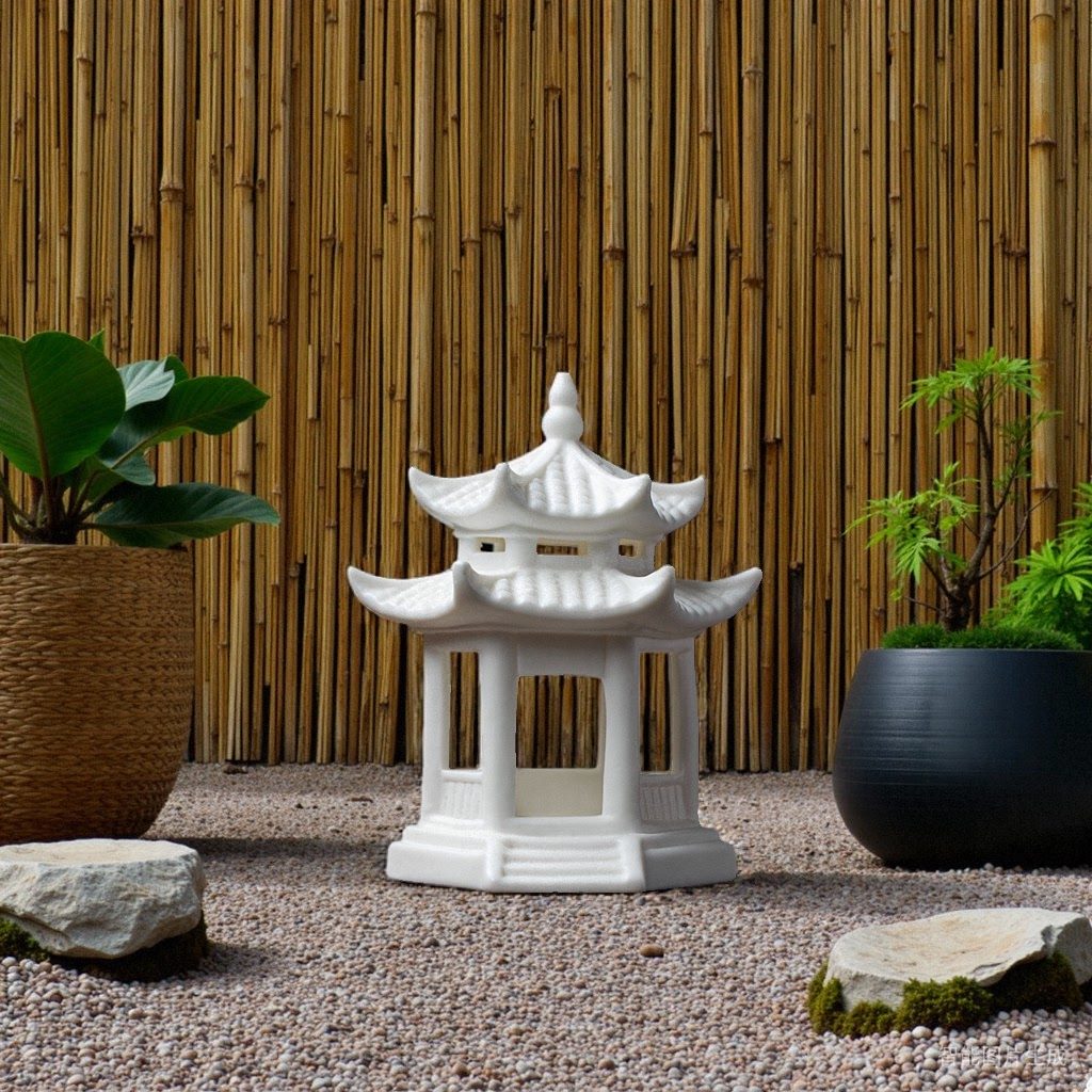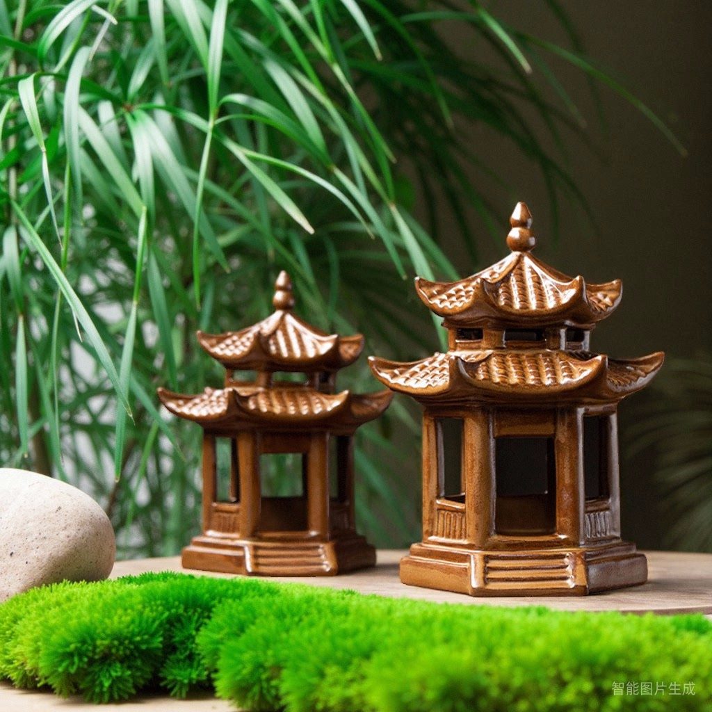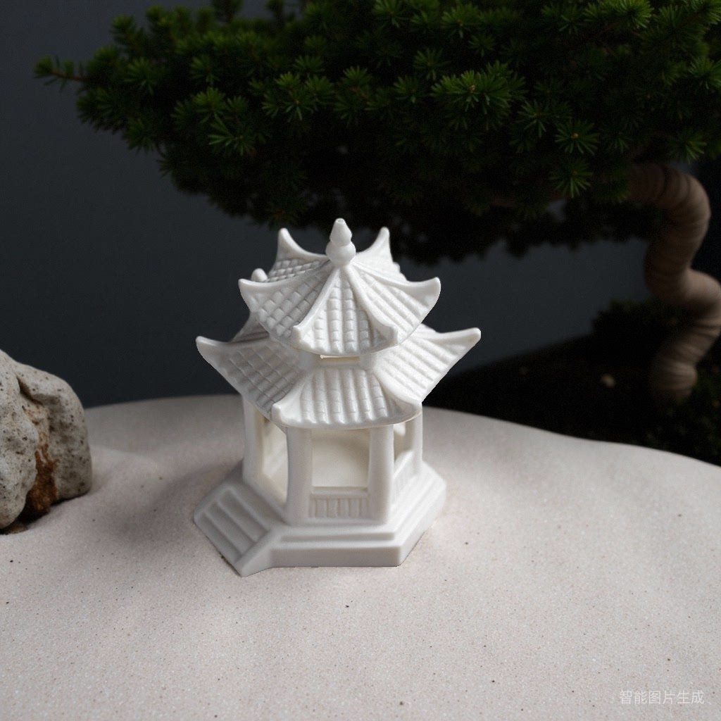 陶瓷六角亭子假山流水装饰摆件微景观枯山水盆景水族箱鱼缸配件