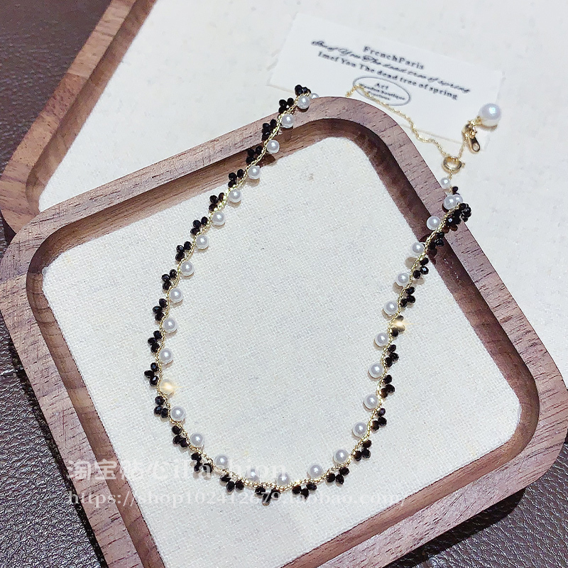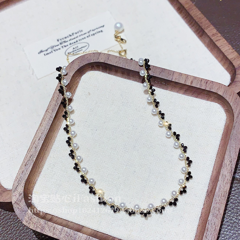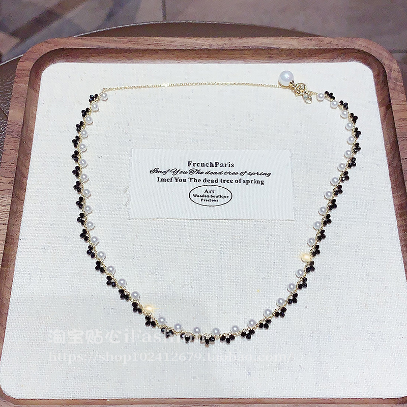 法式水晶锁骨链时尚高级感欧美项链黑色小众独特珍珠颈链项圈项饰