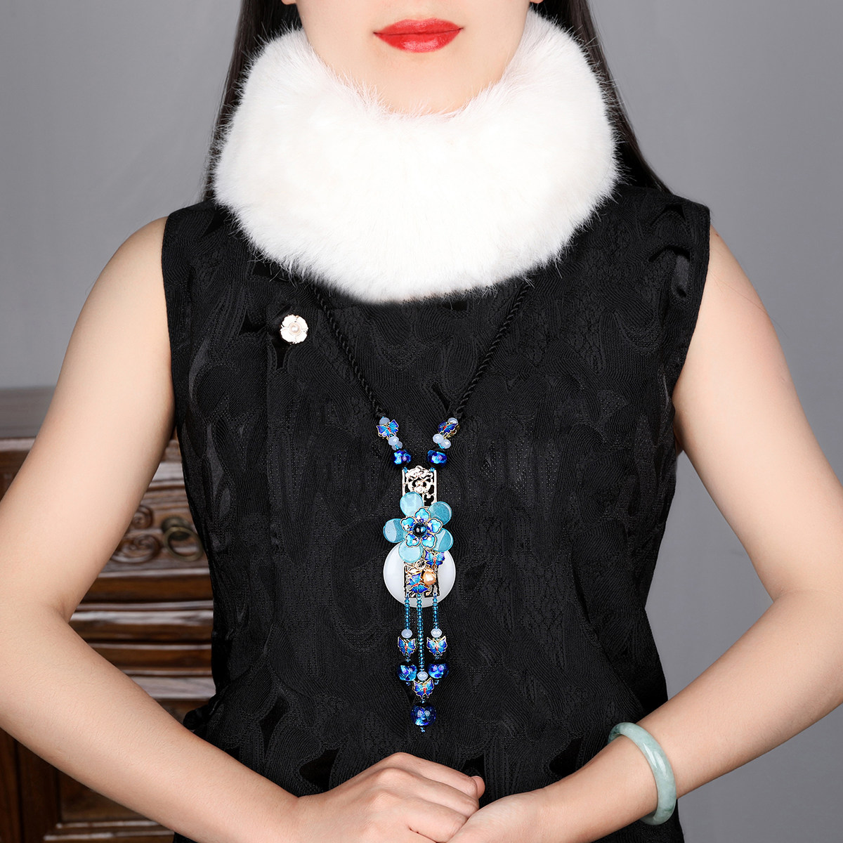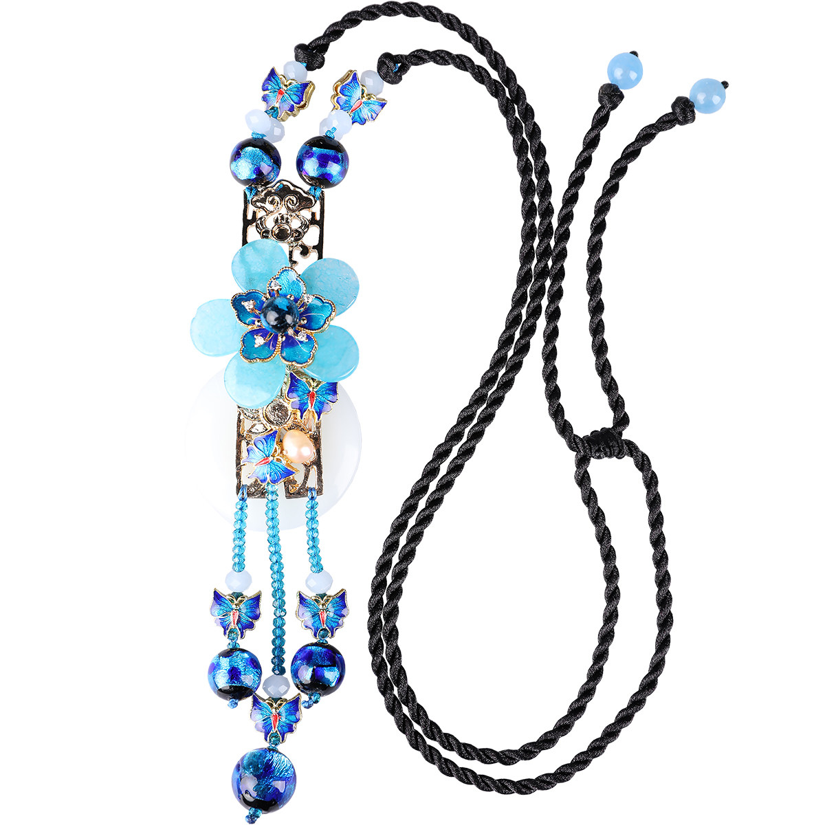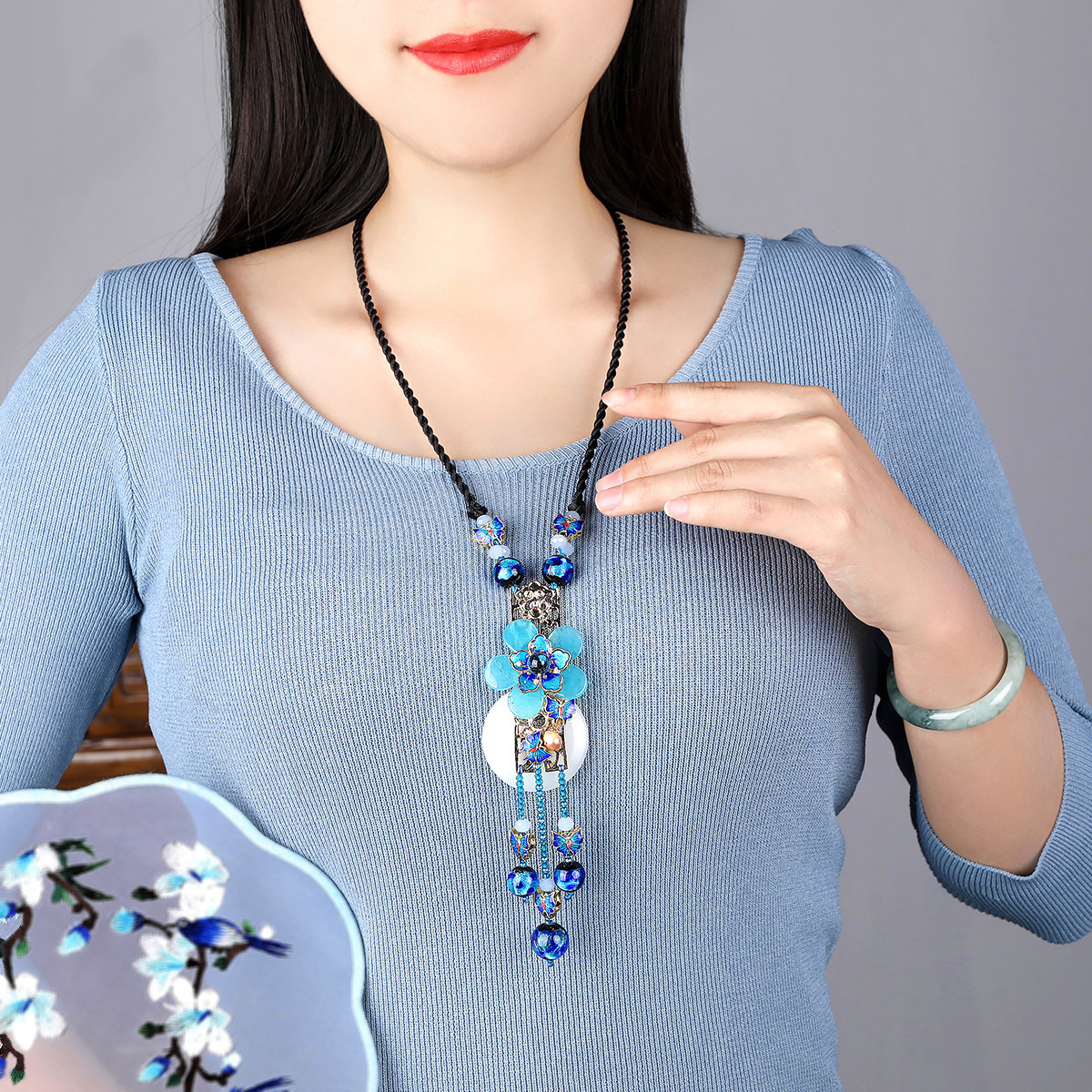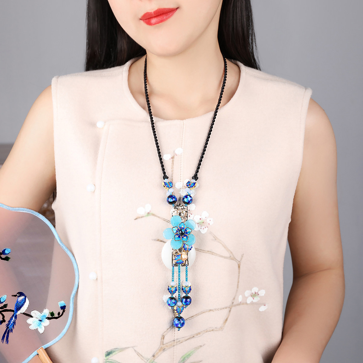 高级感国风蓝色玉石花朵流苏轻奢长项链毛衣链复古原创设计挂件女