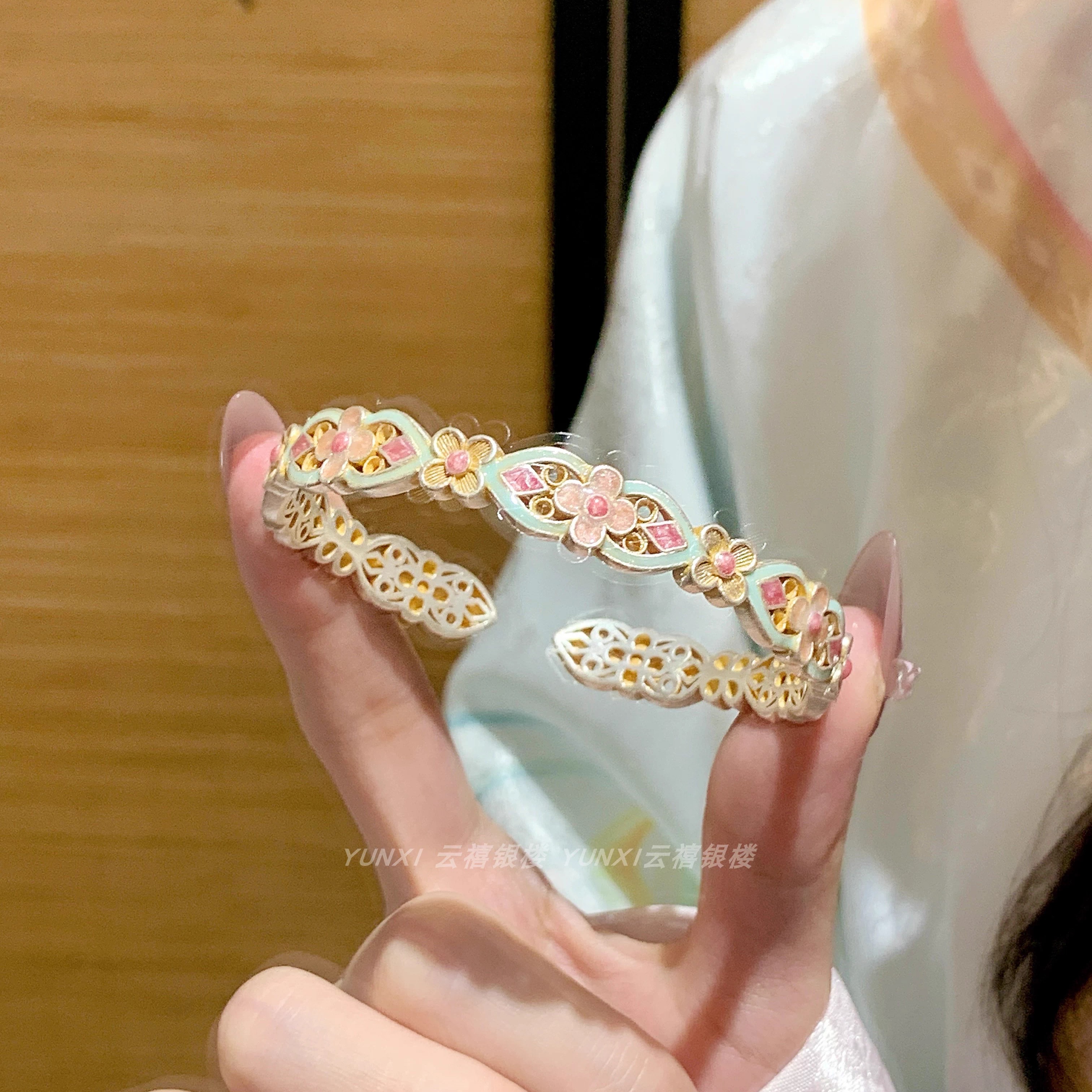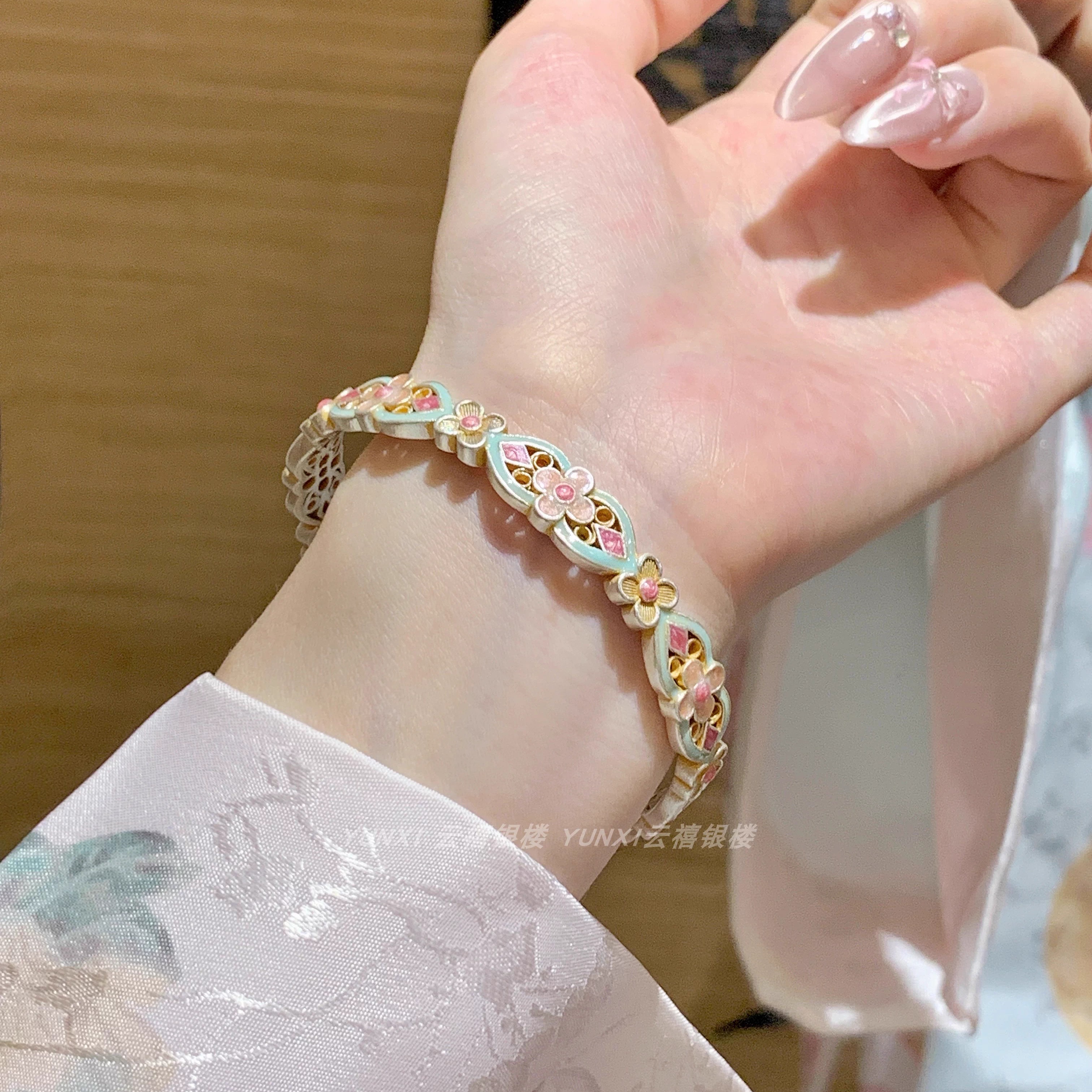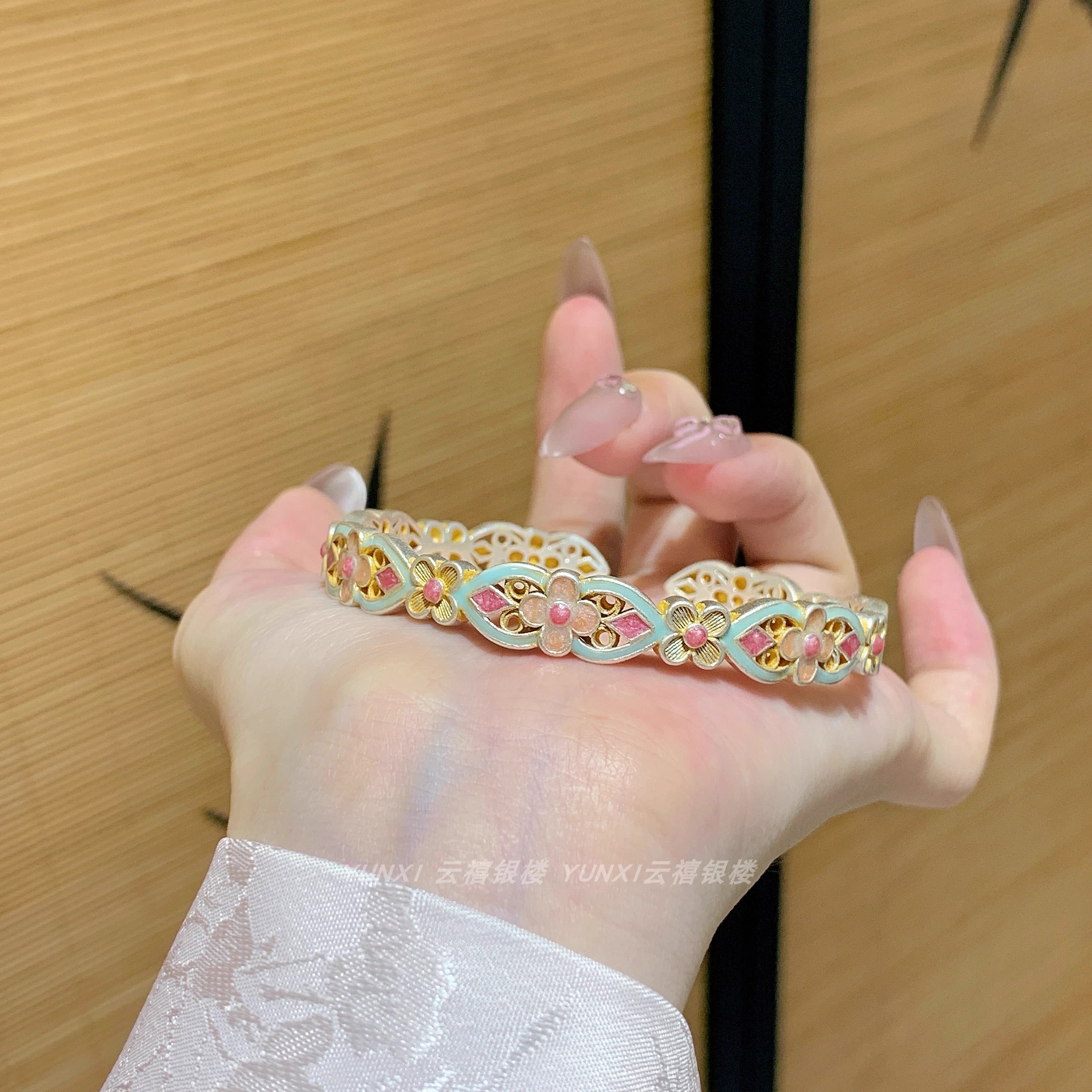 描金珐琅宫廷繁花手镯女足银9999纯银手环新中式银镯子送女友礼物