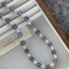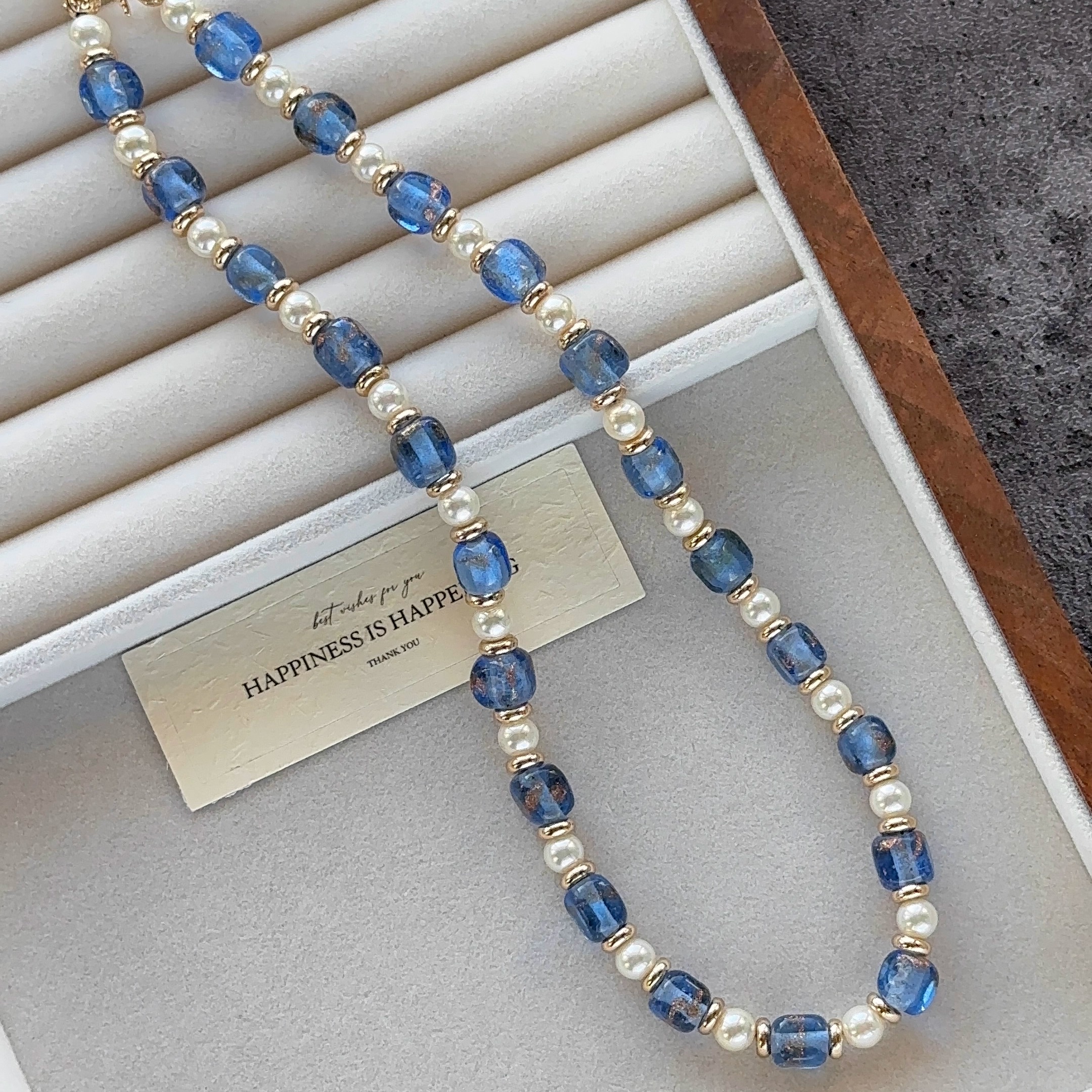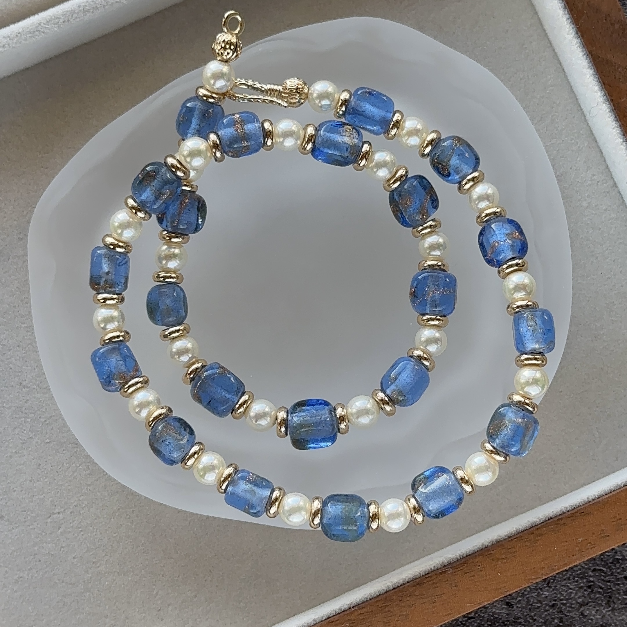 原创手作 显白又神秘的蓝色金沙方块琉璃珠珍珠项链