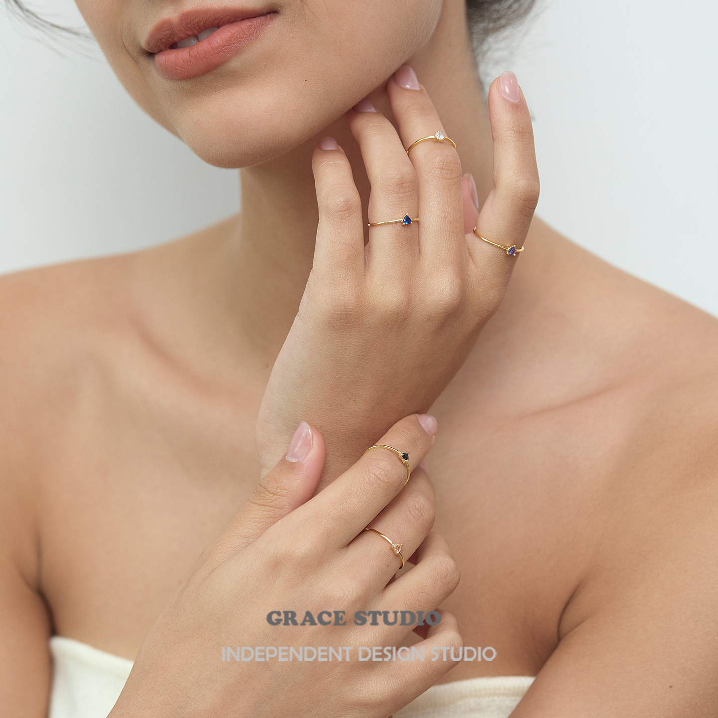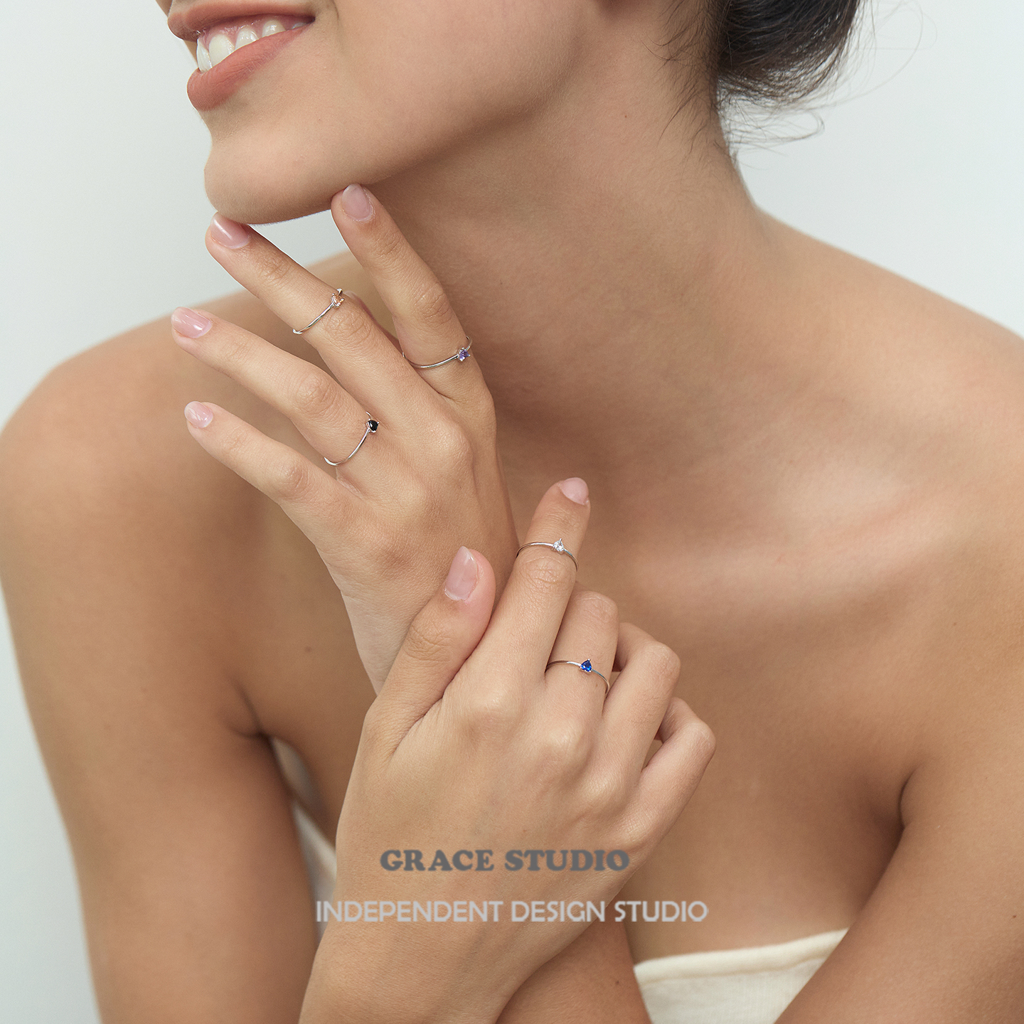 G/S法国女孩 精致极细彩色心形锆石开口戒指纯银爱心简约叠戴指环