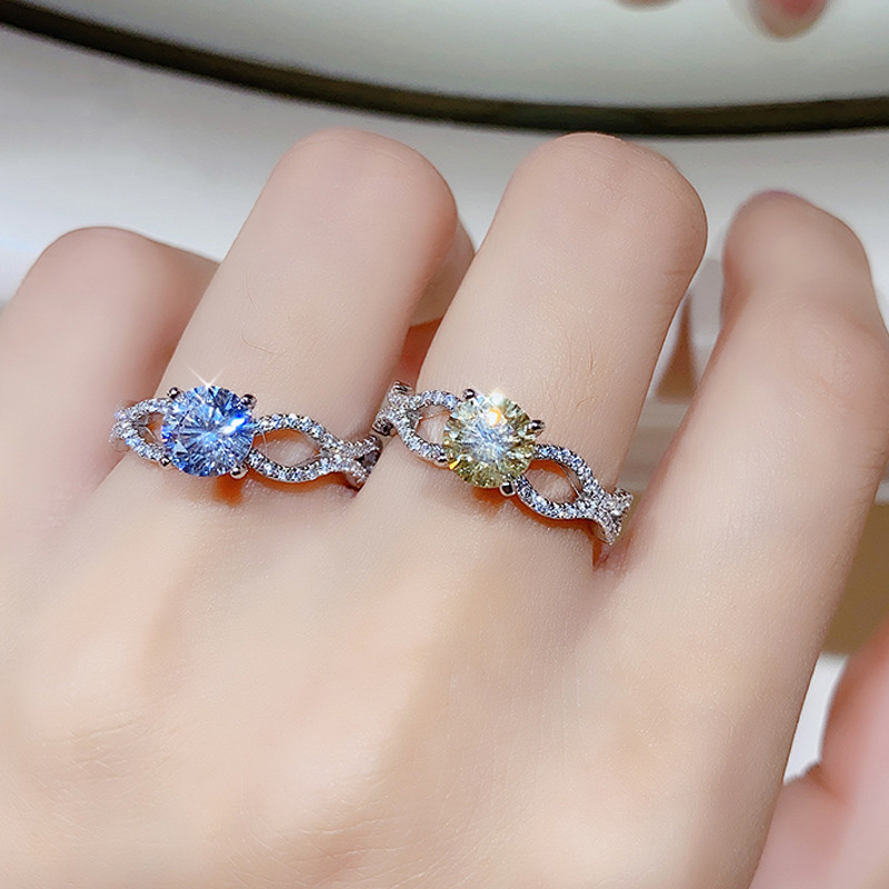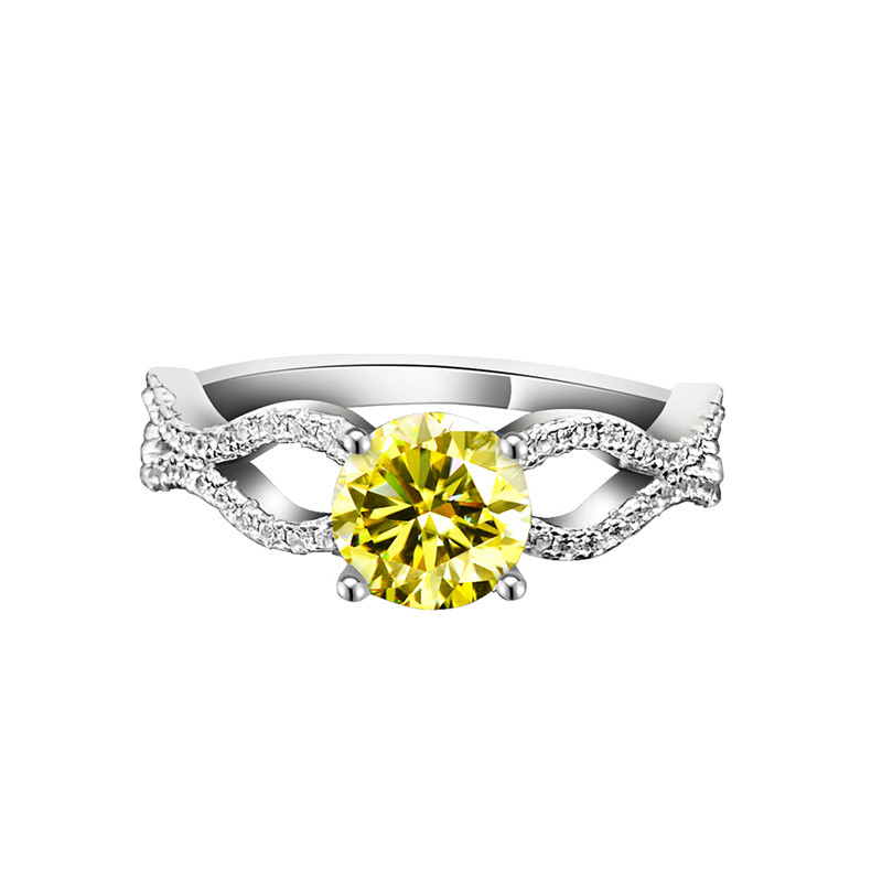 PT950铂金群镶莫桑石1克拉黄钻戒指纯银气质波浪交叉时尚指环通勤