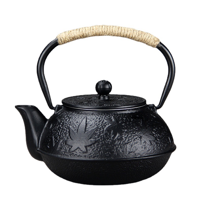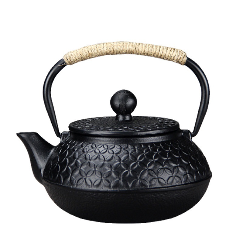 中式禅意民宿装饰品摆件 600ml容量黑色浮雕铸铁壶生铁壶提梁茶壶
