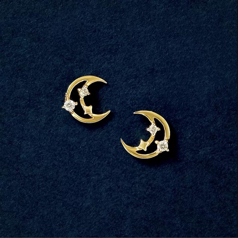 日系轻奢takeup限定 闪烁星辰 新月镂空 小钻 一字型纯银耳钉项链