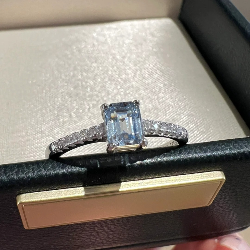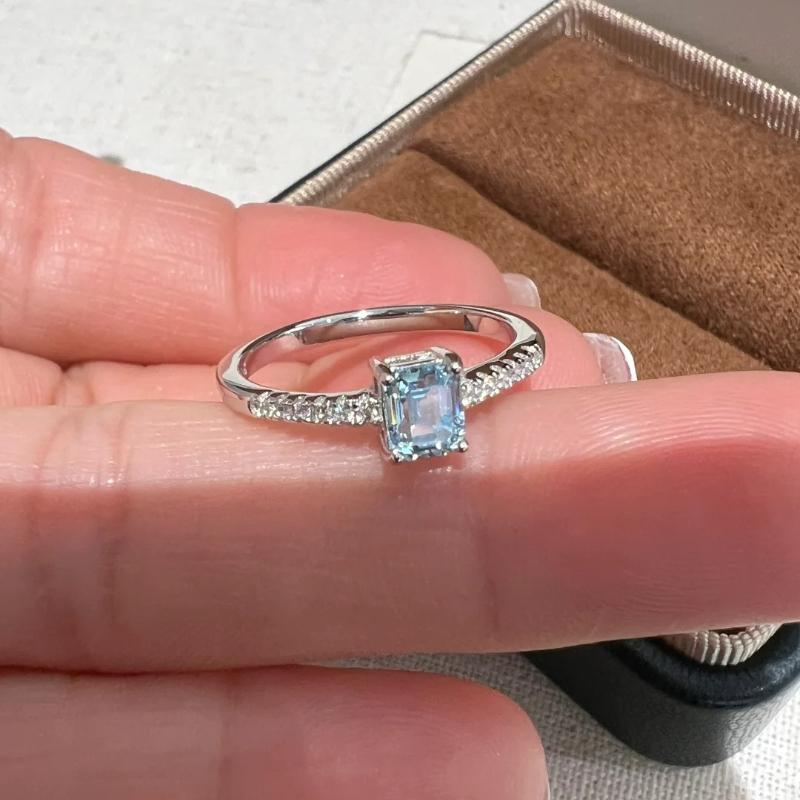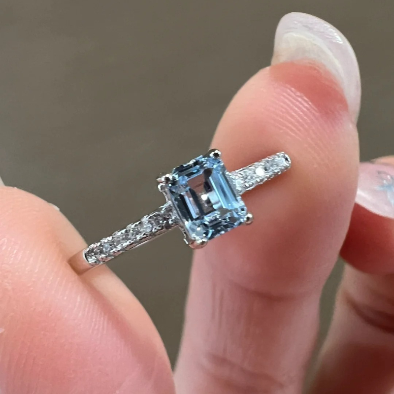 培育宝石戒指女S925纯银小方糖海蓝宝石戒指女士轻奢简约戒环