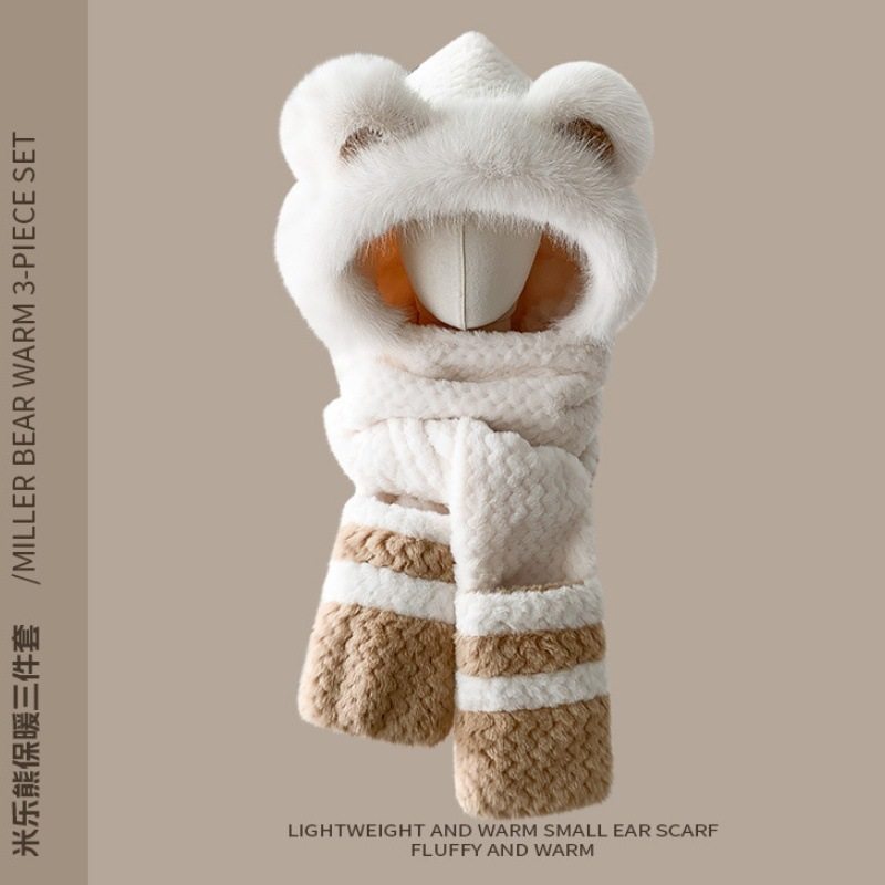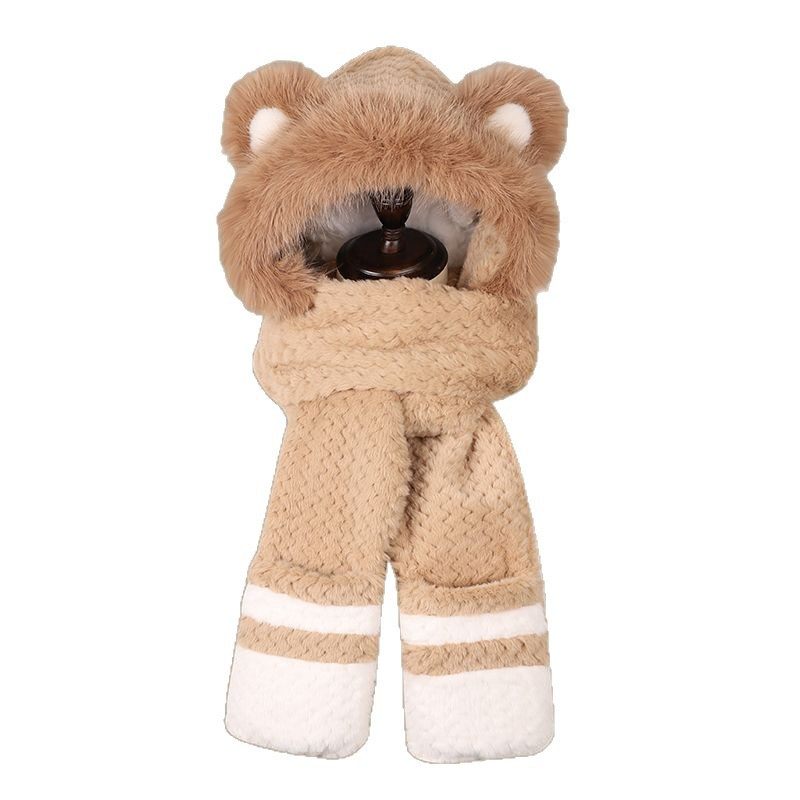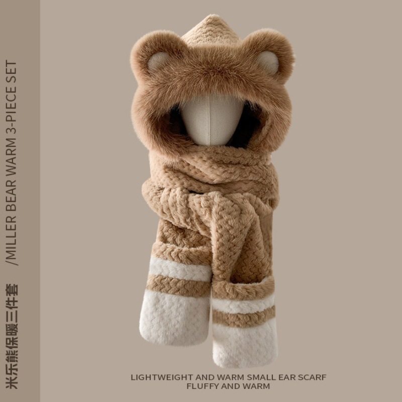 加绒冬季小熊帽子围巾手套一体连帽女秋冬可爱保暖毛绒三件套防寒