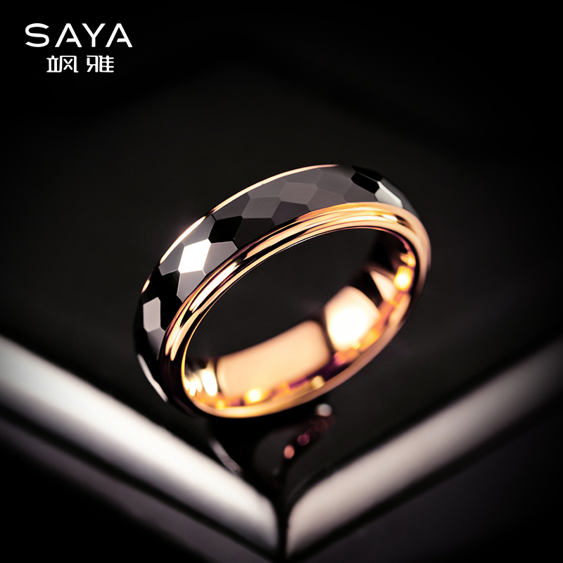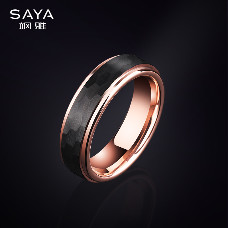 飒雅玫瑰金戒指男士彩金潮牌单身食指黑色锤纹男戒钨金高级感指环