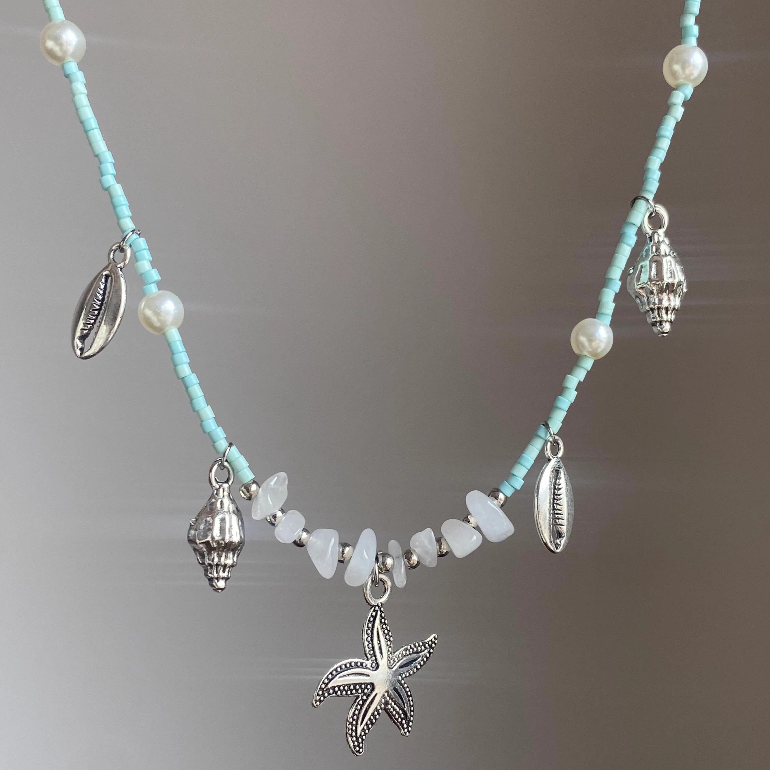 蓝色串珠海星海螺吊坠项链女小众设计感颈链夏日海边度假风锁骨链