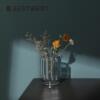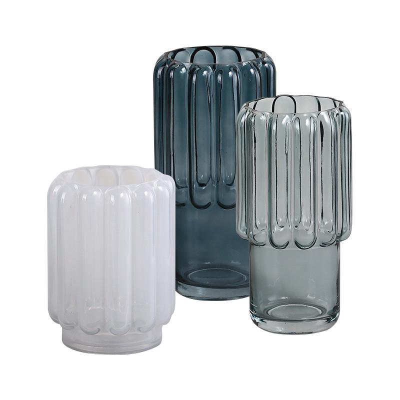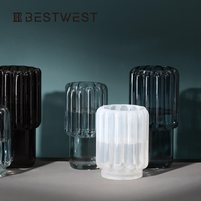 热销博西高脚蓝色透明竖楞家居玻璃花瓶家居设计师客厅软装饰品花