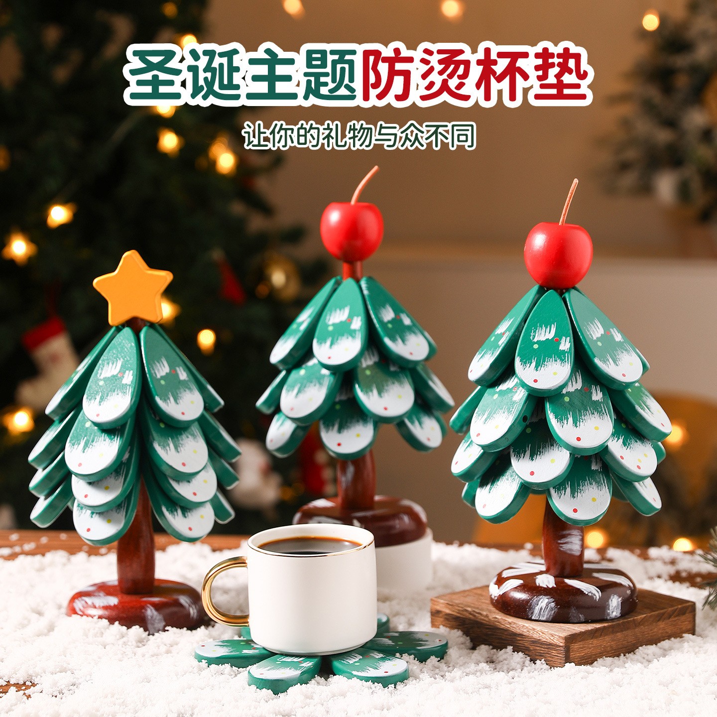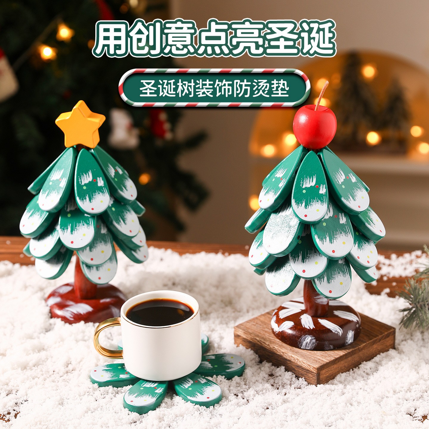 创意高级感实用星星苹果圣诞树复古绿实木隔热垫杯垫防烫餐桌摆件