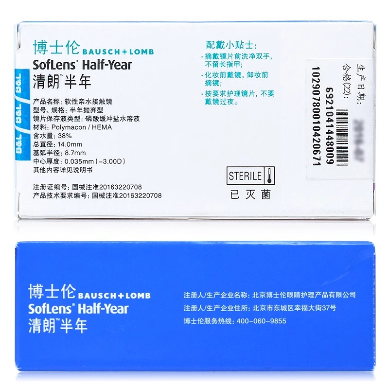 博士伦清朗国产半年抛薄隐形眼镜轻薄 2片/盒(