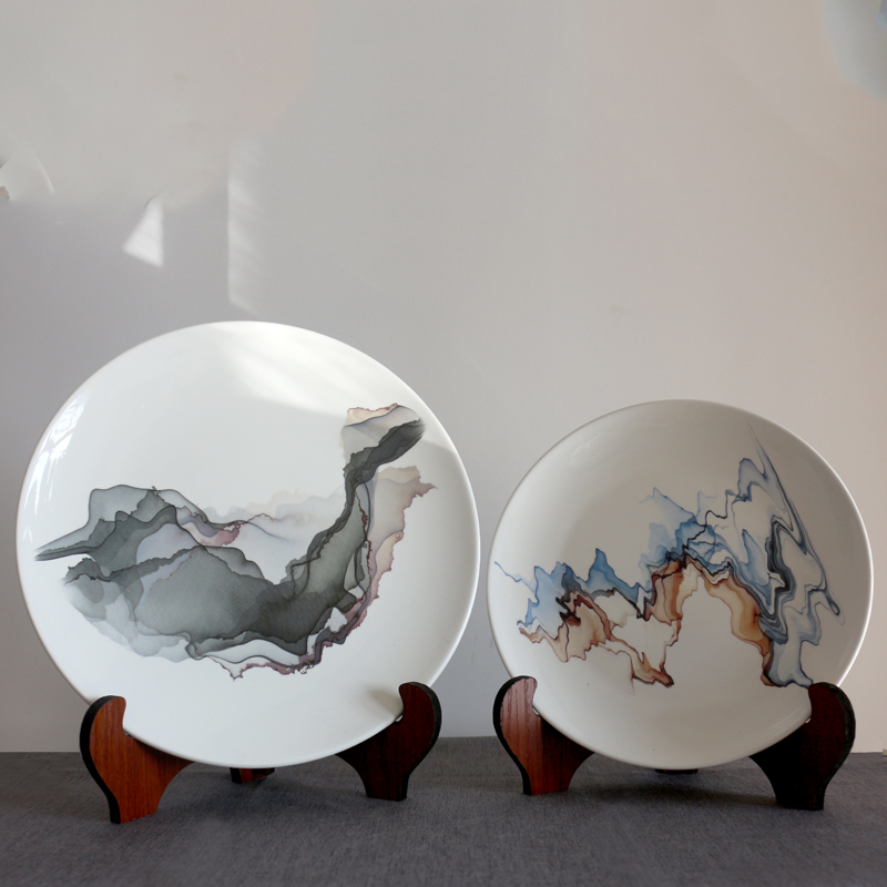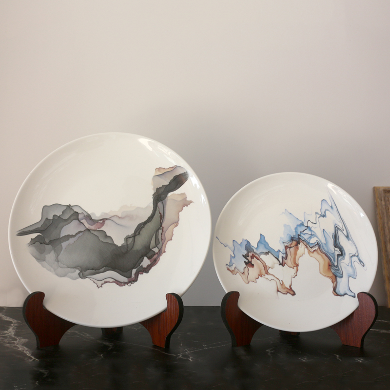 中式国风陶瓷水墨挂盘摆件创意艺A术摆盘客厅家居工艺装饰托架礼