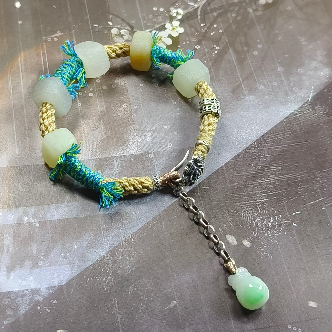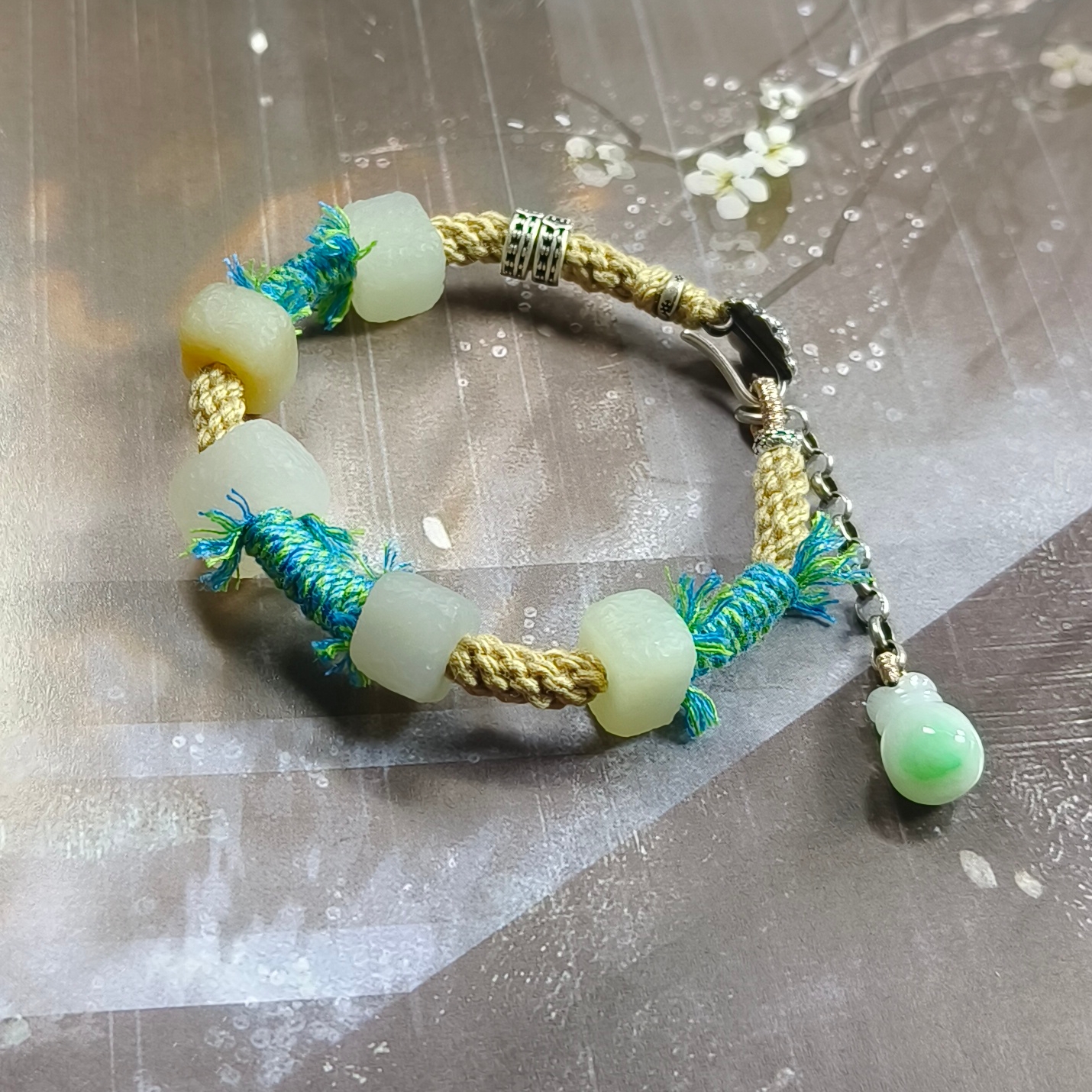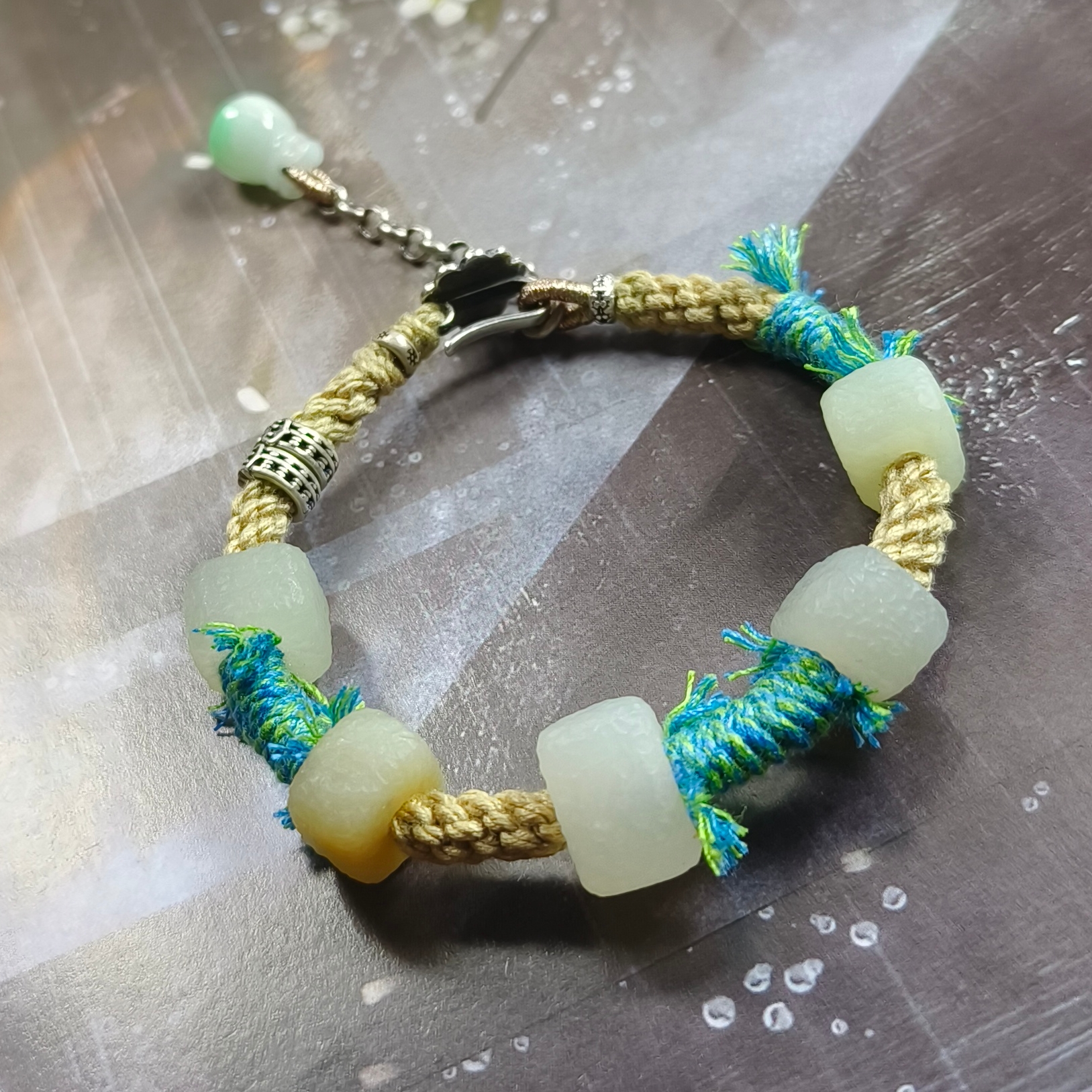 天然和田玉磨砂老光方扣手工棉线编织设计藏风手链新中式国风女款