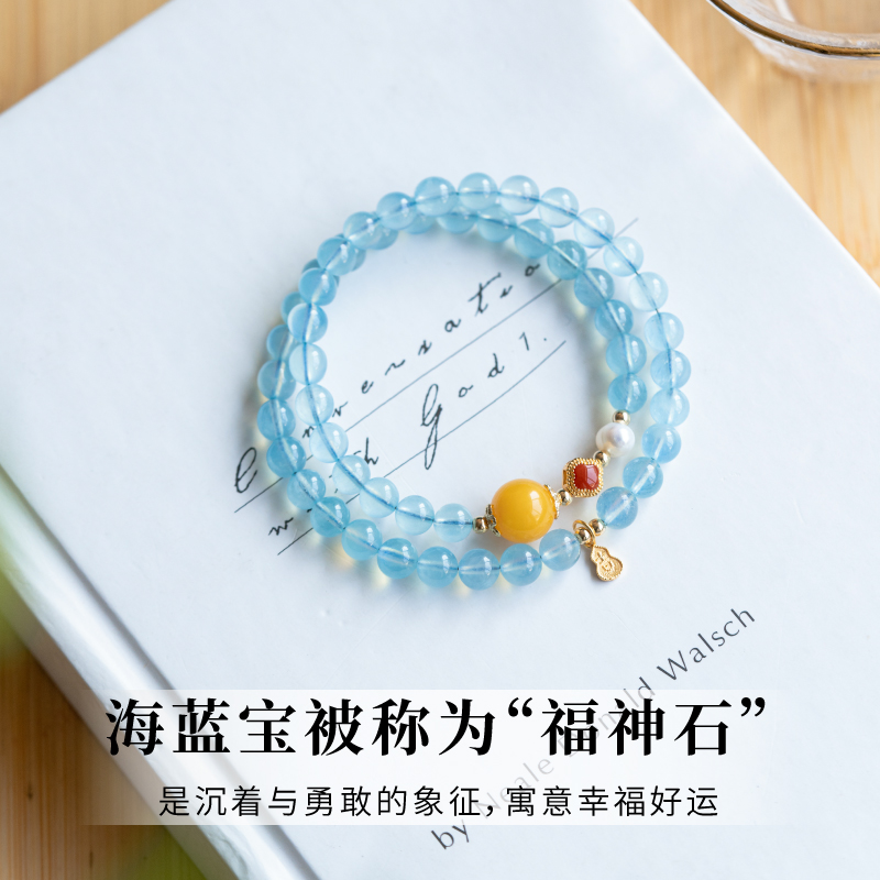 海蓝宝手串补水五行缺水天然蓝色水晶手链女款蓝宝石多圈蜜蜡串珠