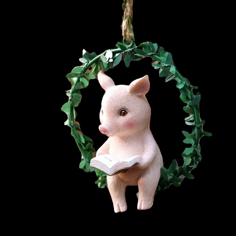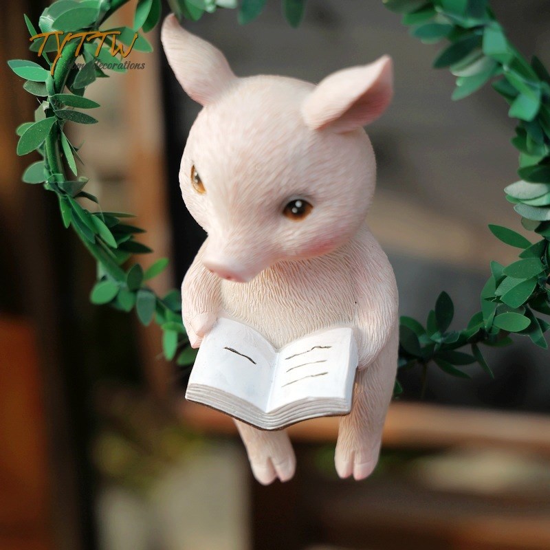 可爱吊环秋千上看书的小粉猪猪花园庭院阳台玄关造景挂饰摆件