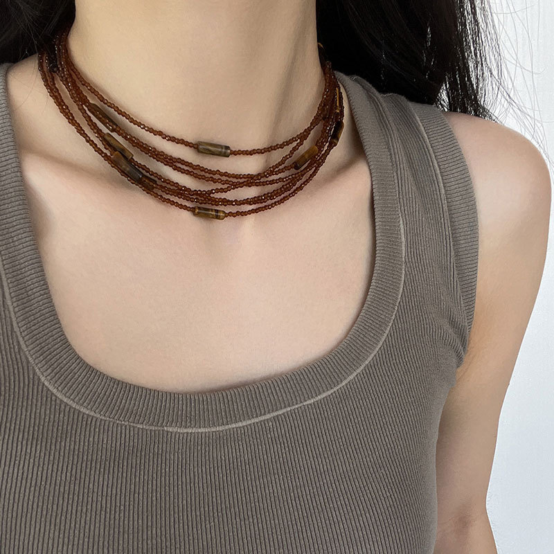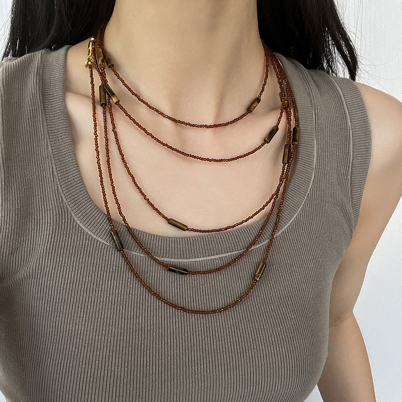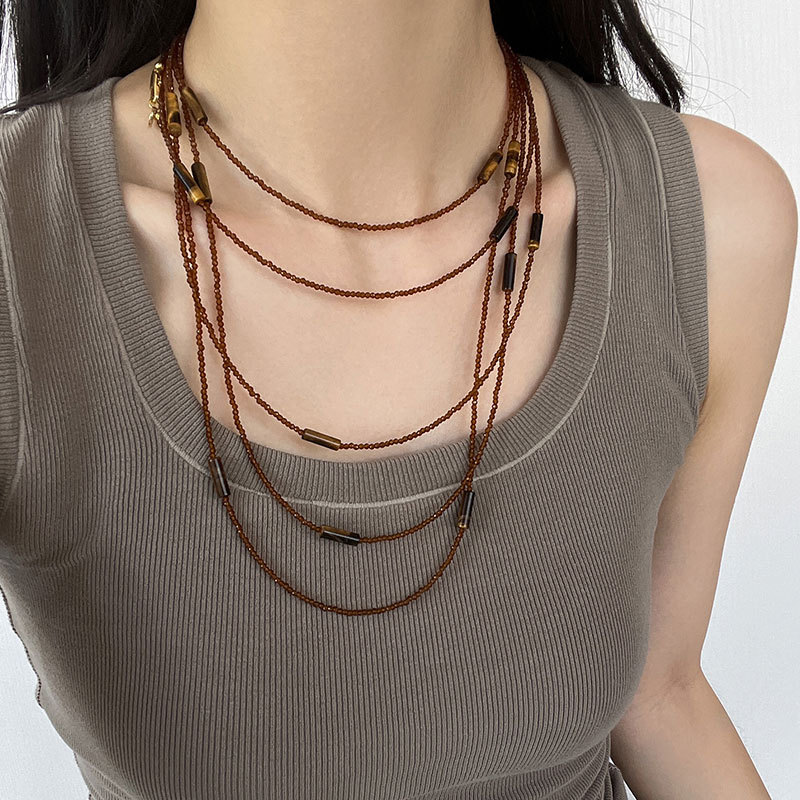 复古轻奢棕色水晶串珠长款项链女一款多戴个性时尚潮流颈链锁骨链