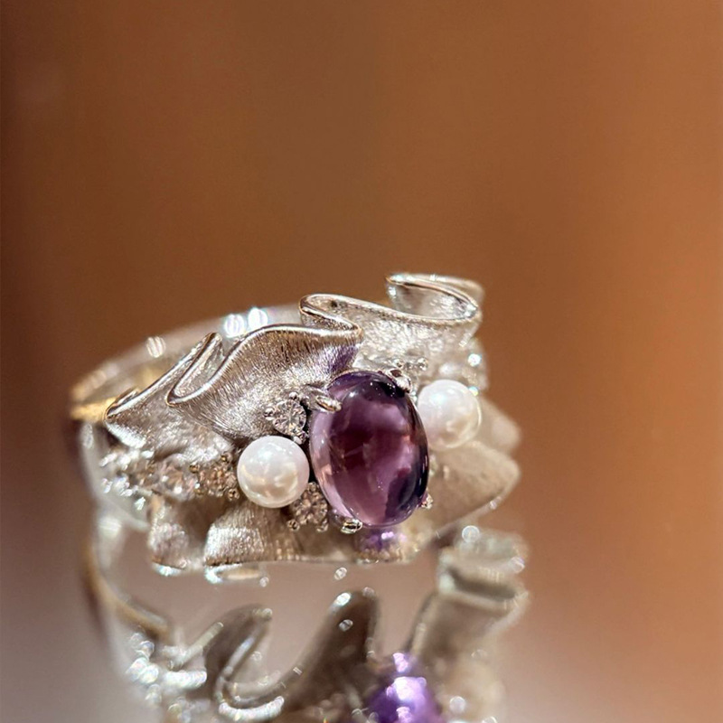 小红书爆款莫奈花园在逃公主珍珠紫裙戒指紫荆花鸽子蛋银色指环女