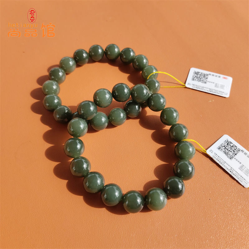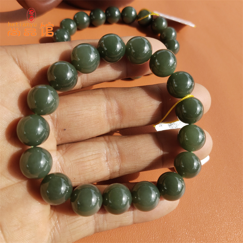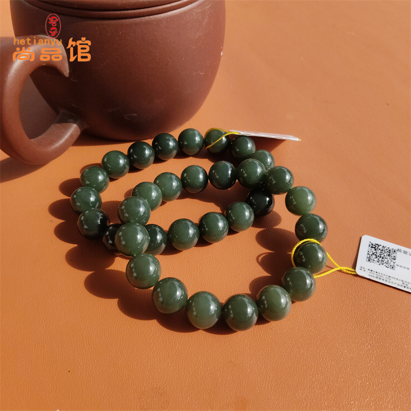 湖绿色12mm圆珠手串青海料和田玉深绿手钏