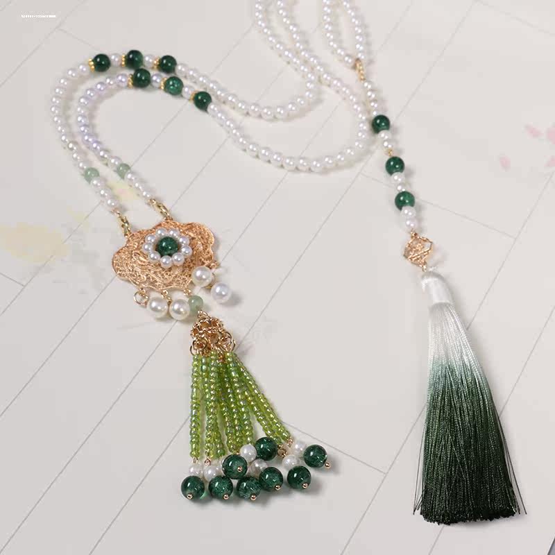 压襟汉服旗袍国风配饰晚明风绿色米珠项链冰丝渐变流苏背云长璎珞
