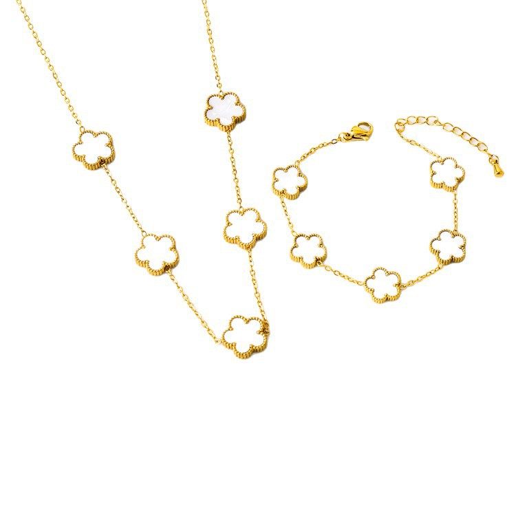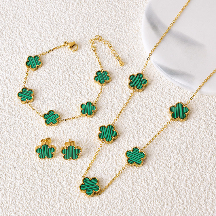 18K真空电渡【13mm】双面五花项链五叶草手链钛钢耳钉三件套装