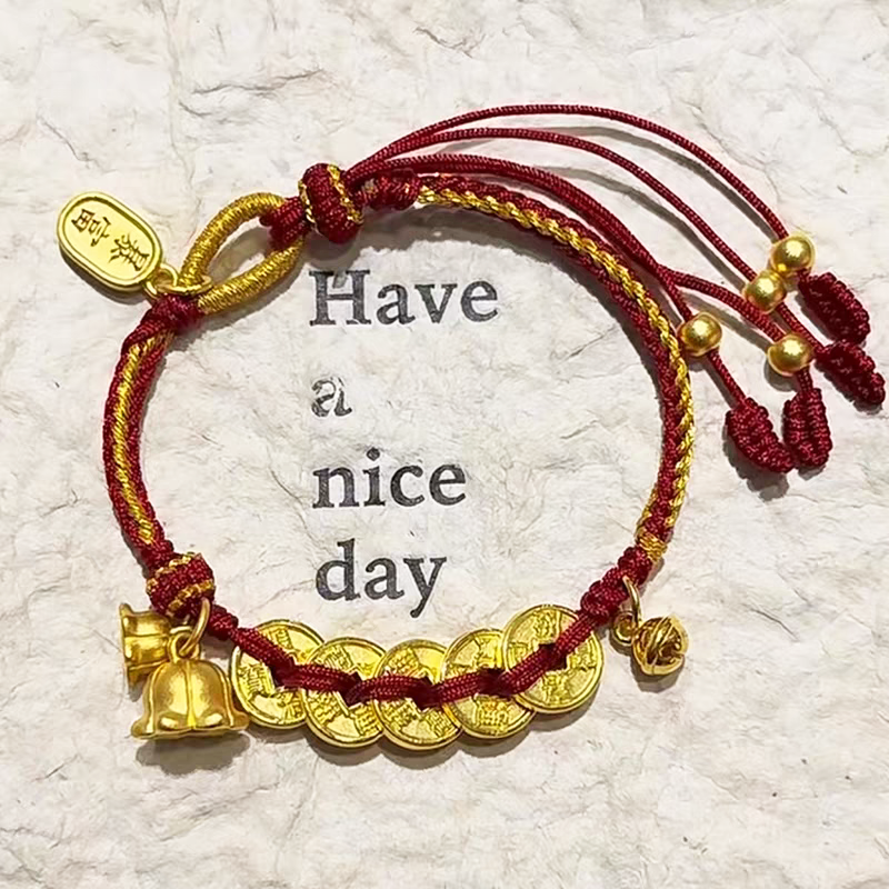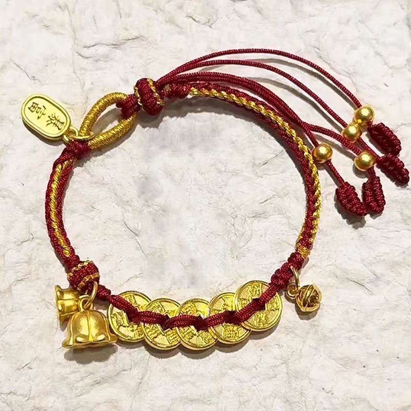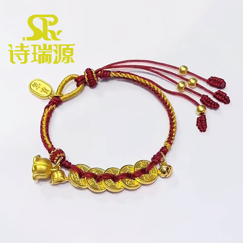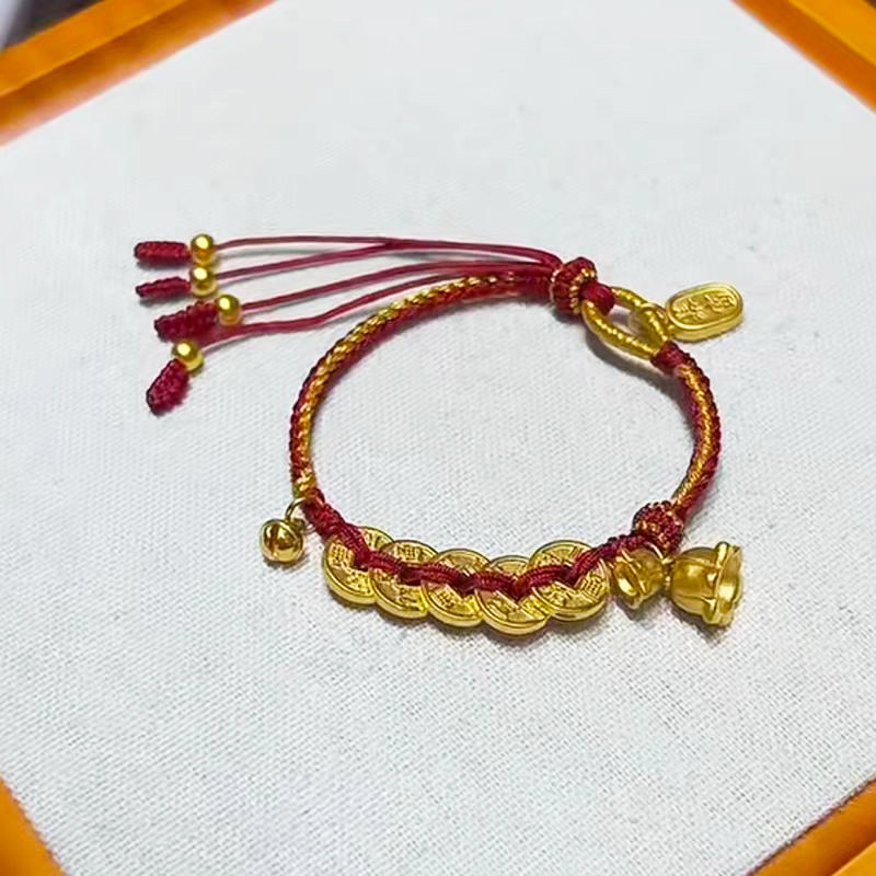 黄金五帝币手链999足金铃兰花钱币手绳新款3D硬金暴富金手链女款