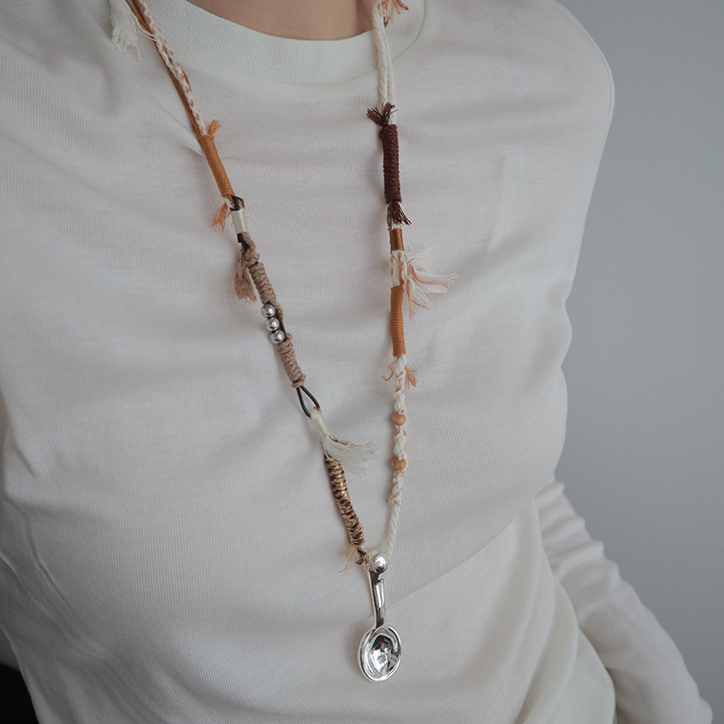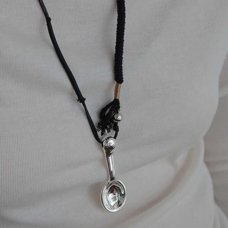 王鹤棣同款铜镀银编织复杂绳子印第安勺子项链可调节毛衣链黑色