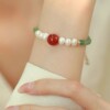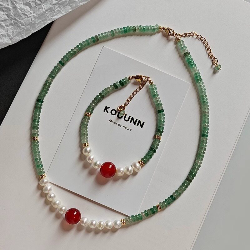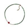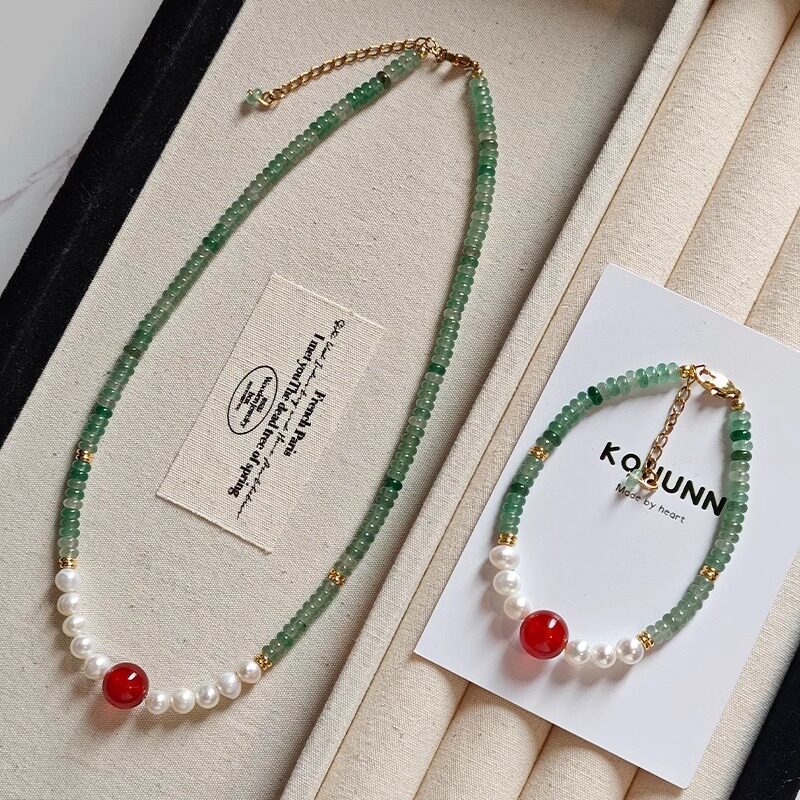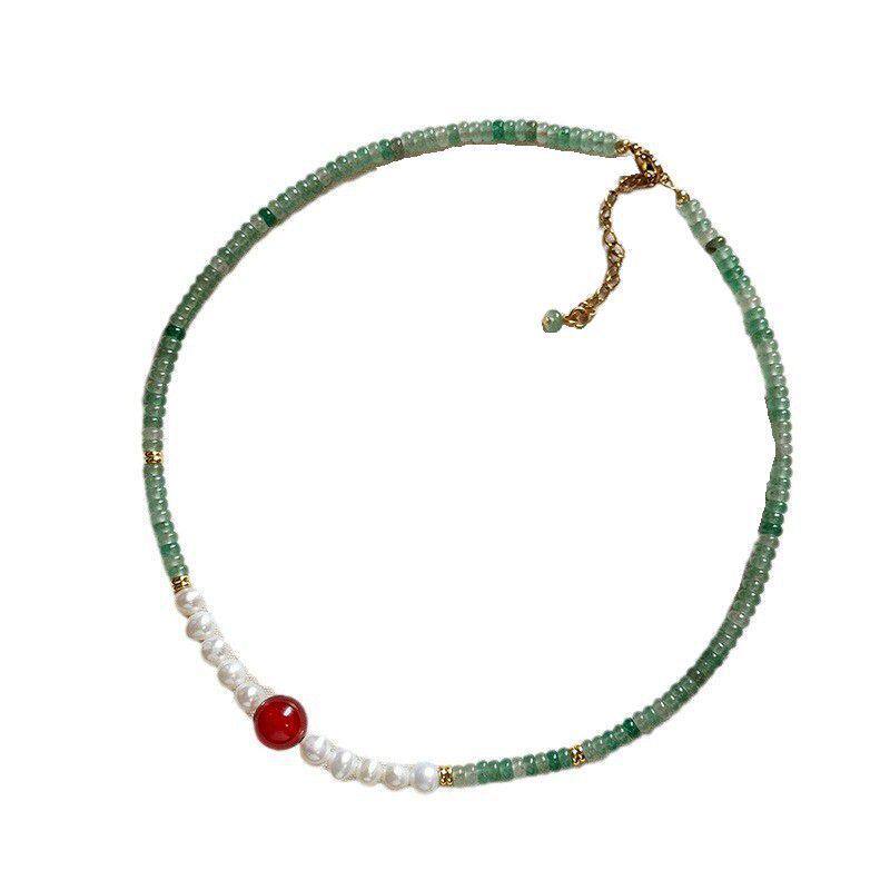 绿色琉璃米珠珍珠项链女复古锁骨链东陵玉淡水珍珠组合